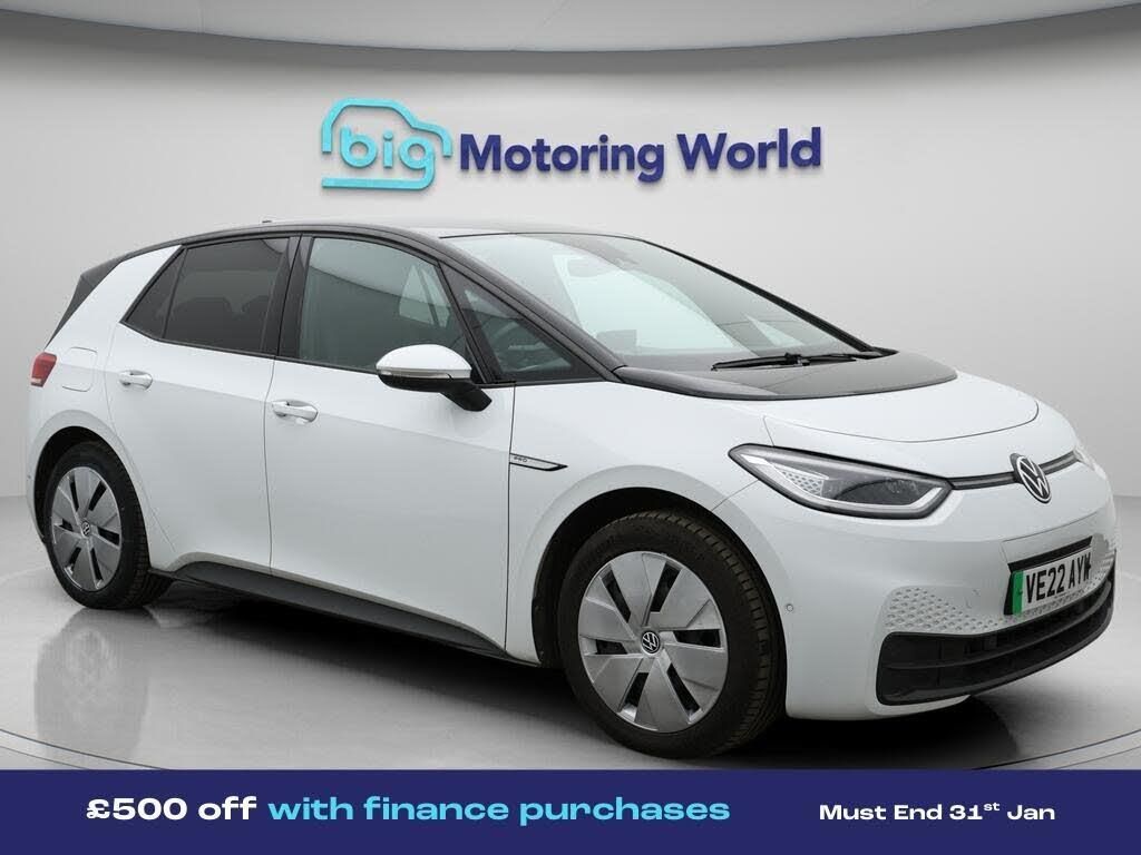 £500 towards your finance depo-Our Volkswagen ID.3 comes with optional extras worth £665. Specification includes a range of fantastic features including £500 towards your finance deposit, Panoramic Roof, Part Leather Seats, Apple CarPlay, Adaptive Cruise Control, Lane Assist, Android Auto, Satellite Navigation, Privacy Glass, Heated Seats Specification information is supplied by CAPHPI and may vary to the actual car. This data does not form any part of a buying contact. Please check specification prior to purchase in-store. The MOT is valid until January 2027, visit bigmotoringworld.co.uk for more photos, a 360 tour, service history and a free HPI report.Were BIG on peace of mind and this White Volkswagen ID.3 has completed our comprehensive 200 point inspection and passed all checks. Its ready for you to drive away with immediate collection in-store. We include a 90-day warranty as standard plus an option to extend for up to 3 years.Reserve this car exclusively for you, safely and securely at bigmotoringworld.co.uk, with a fully refundable £99 deposit. Test drive before you buy, with no commitment, no hassle and a completely haggle free experience. Still searching and want to see thousands more cars? We are BIG on choice with over 8000 cars to choose from.Visit our award winning web site bigmotoringworld.co.uk.Were Big Motoring World and were BIG on what matters to you.