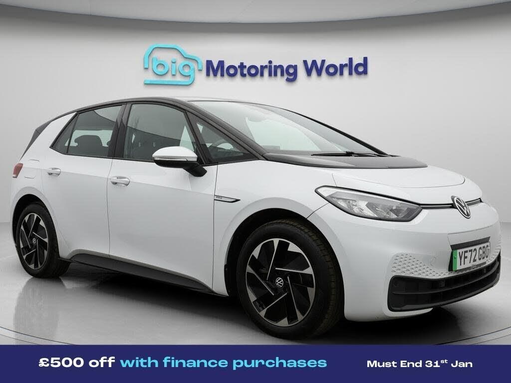 £500 towards your finance depo-Our Volkswagen ID.3 is finished in White. Specification includes a range of fantastic features including £500 towards your finance deposit, Apple CarPlay, Adaptive Cruise Control, Lane Assist, Android Auto, Satellite Navigation, Heated Seats, Heated Steering Wheel, Bluetooth, Blind Spot Assist Specification information is supplied by CAPHPI and may vary to the actual car. This data does not form any part of a buying contact. Please check specification prior to purchase in-store. The MOT is valid until December 2026, visit bigmotoringworld.co.uk for more photos, a 360 tour, service history and a free HPI report.Were BIG on peace of mind and this White Volkswagen ID.3 has completed our comprehensive 200 point inspection and passed all checks. Its ready for you to drive away with immediate collection in-store. We include a 90-day warranty as standard plus an option to extend for up to 3 years.Reserve this car exclusively for you, safely and securely at bigmotoringworld.co.uk, with a fully refundable £99 deposit. Test drive before you buy, with no commitment, no hassle and a completely haggle free experience. Still searching and want to see thousands more cars? We are BIG on choice with over 8000 cars to choose from.Visit our award winning web site bigmotoringworld.co.uk.Were Big Motoring World and were BIG on what matters to you.