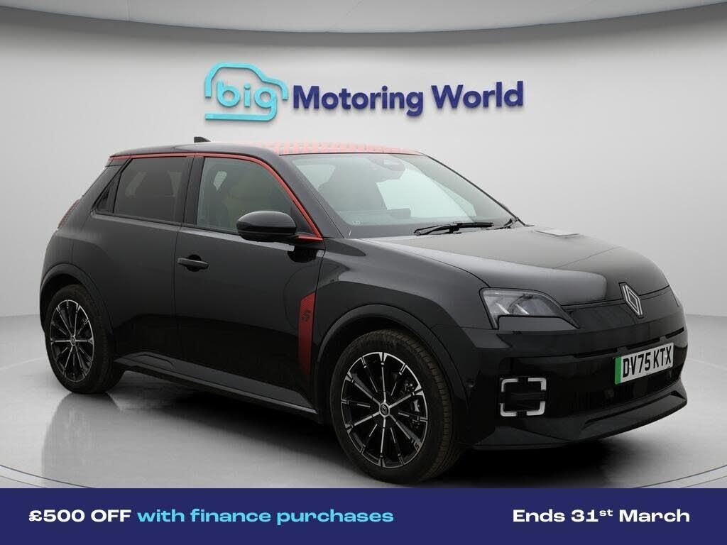 £500 towards your finance depo-Our Renault 5 E-Tech electric is finished in Black. Specification includes a range of fantastic features including £500 towards your finance deposit, 18'' alloy wheels, Part Leather Seats, Apple CarPlay, Adaptive Cruise Control, Lane Assist, Android Auto, Privacy Glass, Heated Seats, Rear View Camera Specification information is supplied by CAPHPI and may vary to the actual car. This data does not form any part of a buying contact. Please check specification prior to purchase in-store. The MOT is valid until October 2028, visit bigmotoringworld.co.uk for more photos, a 360 tour, service history and a free HPI report.Were BIG on peace of mind and this Black Renault 5 E-Tech electric has completed our comprehensive 200 point inspection and passed all checks. Its ready for you to drive away with immediate collection in-store. We include a 90-day warranty as standard plus an option to extend for up to 3 years.Reserve this car exclusively for you, safely and securely at bigmotoringworld.co.uk, with a fully refundable £99 deposit. Test drive before you buy, with no commitment, no hassle and a completely haggle free experience. Still searching and want to see thousands more cars? We are BIG on choice with over 8000 cars to choose from.Visit our award winning web site bigmotoringworld.co.uk.Were Big Motoring World and were BIG on what matters to you.