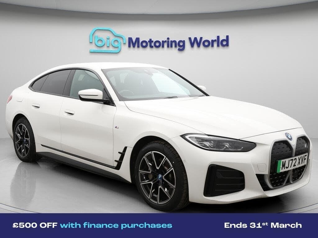 £500 towards your finance depo-Our BMW i4 comes with optional extras worth £720. Specification includes a range of fantastic features including £500 towards your finance deposit, Sun Protection Pack, Leather Seats, Apple CarPlay, Connected Package Professional, M Sport Exterior Styling Pack, M Sport Bodykit, Android Auto, Satellite Navigation, Privacy Glass Specification information is supplied by CAPHPI and may vary to the actual car. This data does not form any part of a buying contact. Please check specification prior to purchase in-store. The MOT is valid until October 2026, visit bigmotoringworld.co.uk for more photos, a 360 tour, service history and a free HPI report.Were BIG on peace of mind and this White BMW i4 has completed our comprehensive 200 point inspection and passed all checks. Its ready for you to drive away with immediate collection in-store. We include a 90-day warranty as standard plus an option to extend for up to 3 years.Reserve this car exclusively for you, safely and securely at bigmotoringworld.co.uk, with a fully refundable £99 deposit. Test drive before you buy, with no commitment, no hassle and a completely haggle free experience. Still searching and want to see thousands more cars? We are BIG on choice with over 8000 cars to choose from.Visit our award winning web site bigmotoringworld.co.uk.Were Big Motoring World and were BIG on what matters to you.