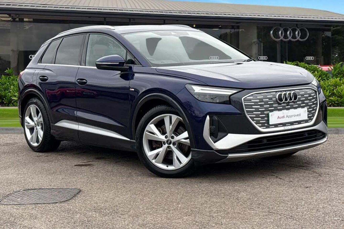 Check out this Audi Approved Q4 S Line 40 e-tron in Navarra Blue with its 20" 5-Y-spoke alloy wheels which look superb out on the roads. The LED headlights with LED rear lights, create that strong visibility in all weather conditions. This Q4 has some fantastic features, such as the heated front seats which are perfect for those cooler mornings. The rear parking sensors assist greatly whilst maneuvering those tighter spaces. Connectivity is made seamless on all journeys, thank to the Bluetooth Interface. Another great feature, is the Ambient lighting pack which enhances the cabins ambiance and improves visibility of controls at night. The privacy glass creates that additional privacy for passengers on all journeys. Comfort is maximised behind the wheel, thanks to the 4-way electric lumbar support. The multimedia interface allows the driver and front passenger to access a range of different media, such as Apple Carplay and Android Auto, allowing you to use apps like Spotify, Google Maps, Apple Music and other apps also. The Audi drive select feature lets you choose your prefered drive mode on any journey, for a more personalised driving experience. The driver assist can also be adjusted to your driving preference on all journeys. ISOFIX is fitted to the front passenger and outer rear seats of this vehicle which allows this vehicle to carry children safely and creates a family friendly environment. DAB/FM radio is fitted to this vehicle which gives a larger variety of stations for all passengers and driver to listen to and enjoy on any journey in this vehicle. This vehicle will benefit from remainder of Manufacturer's Warranty or minimum 1-year warranty and 1 year's roadside assistance at the point of purchase. Please contact Crewe Audi for more information or enquire online today. This vehicle meets the requirements ULEZ. By driving a low emissions vehicle, you are helping to improve air quality and reduce the health risks associated with poor air quality.