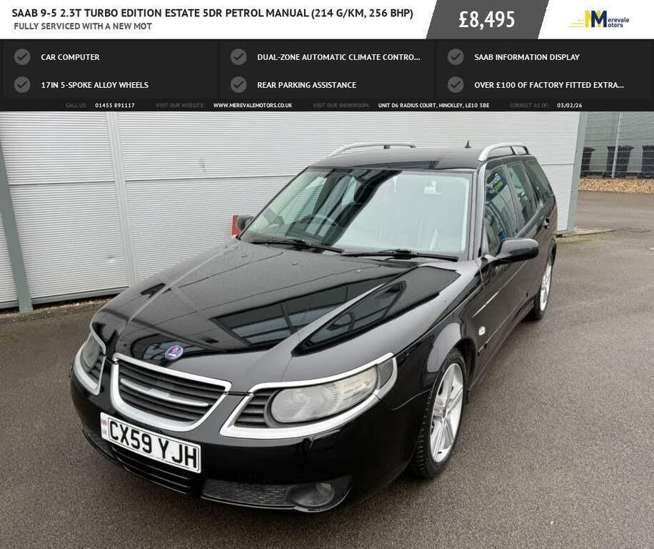 GREAT CONDITION THROUGHOUT THIS VERY WELL MAINTAINED SAAB SPECIAL EDITION SABB 9-5 TURBO EDITION. FEATURES INCLUDE ALLOY WHEELS, FULL LUXURY LEATHER WITH ELECTRIC SEATS, CLIMATE CONTROL AND REAR PARKING ASSIST.. THE PERFORMANCE OF THIS SAAB IS TRULY NOTEWORTHY, WITH ITS ABILITY TO ACCELERATE FROM 0 TO 60 IN JUST 6.9 SECONDS. THIS IMPRESSIVE ACCELERATION DEMONSTRATES A LEVEL OF RESPONSIVENESS AND POWER THAT SETS IT APART FROM MANY OTHERS IN ITS CLASS MAKING FOR AN ENGAGING DRIVING EXPERIENCE. THIS HAS JUST HAD A FULL SERVICE INCLUDING REMOVAL OF THE SUMP AND FULL CLEAM OF THE OIL PUMP. PLEASE CALL 01455891117 TO ARRANGE A VIEWING AND TEST DRIVE AS THIS CAR IS IN STORAGE. EXPECT A GREAT DEAL