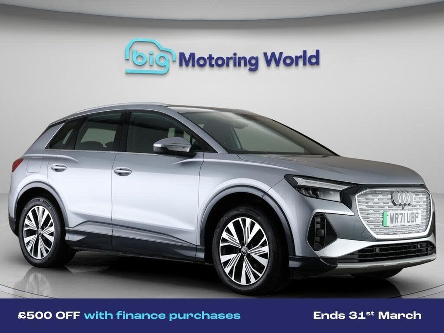 £500 towards your finance depo-Our Audi Q4 e-tron is finished in Silver. Specification includes a range of fantastic features including £500 towards your finance deposit, 19'' Alloy wheels, Apple CarPlay, Lane Assist, Android Auto, Satellite Navigation, Heated Seats, Virtual Cockpit, Rear View Camera, Bluetooth Specification information is supplied by CAPHPI and may vary to the actual car. This data does not form any part of a buying contact. Please check specification prior to purchase in-store. The MOT is valid until October 2026, visit bigmotoringworld.co.uk for more photos, a 360 tour, service history and a free HPI report.Were BIG on peace of mind and this Silver Audi Q4 e-tron has completed our comprehensive 200 point inspection and passed all checks. Its ready for you to drive away with immediate collection in-store. We include a 90-day warranty as standard plus an option to extend for up to 3 years.Reserve this car exclusively for you, safely and securely at bigmotoringworld.co.uk, with a fully refundable £99 deposit. Test drive before you buy, with no commitment, no hassle and a completely haggle free experience. Still searching and want to see thousands more cars? We are BIG on choice with over 8000 cars to choose from.Visit our award winning web site bigmotoringworld.co.uk.Were Big Motoring World and were BIG on what matters to you.