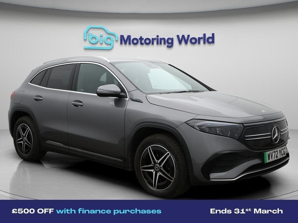 £500 towards your finance depo-Our Mercedes-Benz EQA is finished in Grey. Specification includes a range of fantastic features including £500 towards your finance deposit, Comfort Pack, All Wheel Drive, 18'' alloy wheels, Part Leather Seats, Air Suspension, Apple CarPlay, AMG body styling, Parking Pack, Android Auto Specification information is supplied by CAPHPI and may vary to the actual car. This data does not form any part of a buying contact. Please check specification prior to purchase in-store. The MOT is valid until September 2026, visit bigmotoringworld.co.uk for more photos, a 360 tour, service history and a free HPI report.Were BIG on peace of mind and this Grey Mercedes-Benz EQA has completed our comprehensive 200 point inspection and passed all checks. Its ready for you to drive away with immediate collection in-store. We include a 90-day warranty as standard plus an option to extend for up to 3 years.Reserve this car exclusively for you, safely and securely at bigmotoringworld.co.uk, with a fully refundable £99 deposit. Test drive before you buy, with no commitment, no hassle and a completely haggle free experience. Still searching and want to see thousands more cars? We are BIG on choice with over 8000 cars to choose from.Visit our award winning web site bigmotoringworld.co.uk.Were Big Motoring World and were BIG on what matters to you.