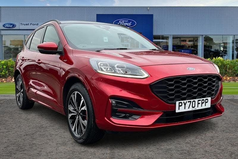 Driver impairment monitor, Ford easy fuel, Ford SYNC 3 with 8 colour touchscreen, App Link, andriod auto/apple carPlay and navigation with Ford pass connect, Front and rear parking sensors, Hands free power tailgate, Intelligent speed assist, Lane keeping aid with lane departure warning, Mobile phone wireless charging pad, Power assist steering, Selectable drive modes, Auto dimming rear view mirror, Auto headlamps with high and low beam, Auto wipers, Black roof rails, Front LED fog lights with cornering function, Full LED headlamps, Large rear spoiler, LED daytime running lights, LED rear lights, Power folding heated door mirrors with puddle lights, Power front/rear windows with global close, Power opening panoramic roof, Privacy glass, Quickclear heated windscreen, ST Line body styling kit with unique front and rear fascia and bumper, rear painted diffuser, front painted skid plates, dark mesh upper grille, ST Line front scuff plates, Twin exhausts, 10 way power adjustable drivers seat, 2nd row sliding seats, 8 way manual passenger seat including lumbar support and height adjust, Alloy pedals, Ambient lighting, Centre console with electronic parking brake, Dark headlining and pillars, Dual electronic automatic temperature control, Flat bottomed leather steering wheel in sensico with red stitching, Front and rear head restraints, Heated passenger and driver seats, Rear charging point, Sensico partial premium leather upholstery, Sports seats, ST Line front and rear floor mats, Unique ST Line leather gear knob, 3x3 point rear seatbelts, Airbags - front driver/passenger, front and rear curtain, Drivers knee airbag, Electronic stability control (ESC) and ABS, Ford MyKey Gen 2 safety system, Post collision braking, Powered child proof rear door locks, Pre collision assist with autonomous emergency braking, Red brake calipers, Tyre pressure monitoring system