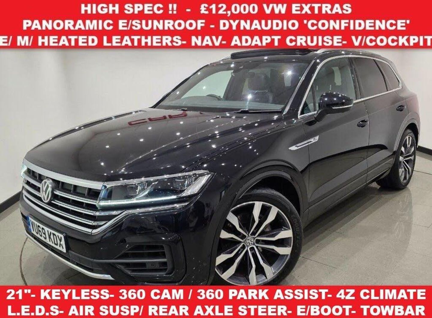 HIGH SPEC WITH £12,000 VW EXTRAS + 1 PREVIOUS KEEPER + MOT EXPIRY NOV 2026 + VW AND SPECIALIST SERVICE HISTORY, 5 SERVICES PERFORMED, LAST SERVICED AT 82,861 MILES ON 22-09-2025 + E/SLIDING PANORAMIC SUNROOF + DEEP BLACK PEARL EFFECT PAINTWORK + SAVONA LEATHER UPHOLSTERY + 14 WAY ELECTRIC-MEMORY-HEATED R-LINE ERGO COMFORT FRONT SPORT SEATS + EASY EXIT SEAT MEMORY + KEYLESS- COMFORT ACCESS + PIANO BLACK AND SILVER WAVE DESIGN ALUMINIUM DECOR INLAYS + AIR SUSPENSION AND REAR AXLE STEERING + HEAT INSULATING PRIVACY GLASS AND HEATED WINDSCREEN - LAMINATED ACOUSTIC + 4 ZONE CLIMATE CONTROL + AMBIENT LIGHTING + AUTO L.E.D. HEADLIGHTS WITH JET WASH + DYNAMIC INDICATORS + HIGH BEAM ASSIST + INNOVATION VIRTUAL COCKPIT + 360 AREA VIEW CAMERA / FRONT / REAR / SIDE CAMERAS + 360 PARK ASSIST AND AUTO PARALLEL PARK ASSIST + DRIVER ALERT SYSTEMS- LANE ASSIST/ LANE KEEPING/ LANE CHANGE/ BLIND SPOT + TRAFIC SIGN RECOGNITION + 4MOTION ACTIVE CONTROL + ELECTRONIC DIFFERENTIAL CONTROL + DRIVING PROFILE SELECTION + R-LINE BODY STYLING + 21 INCH ALLOYS + SPORTS SUSPENSION + POWER FOLD-HEATED E-MIRRORS + E/CHILD LOCKS + AUTO HOLD BRAKES + HILL DESCENT CONTROL + HILL ASSIST + ADAPTIVE CRUISE CONTROL + FRONT ASSIST + SIDE ASSIST + SPEED LIMITER + AUTO BRAKING + DYNAUDIO 'CONFIDENCE' HIGH END AUDIO SYSTEM + 4X USB + NAVIGATION + VOICE CONTROL + BLUETOOTH + SMARTPHONE WIRELESS CHARGING + R-LINE FLAT BOTTOM MULTIFUNCTIONAL LEATHER STEERING WHEEL WITH PADDLESHIFT + TYRE PM + E/TAILGATE + DETACHABLE TOWBAR +++++ PART EXCHANGE WELCOME +++ 3, 6, 12 MONTHS WARRANTIES AVAILABLE +++ DELIVERY POSSIBLE NATIONWIDE (ASK FOR QUOTE) +++ WE ARE 'FCA' APPROVED AND CAN ARRANGE IN HOUSE FINANCE +++ Every effort has been made to ensure the accuracy of the above vehicle's information but errors may occur. Please check with a salesperson any details that are important to you and may influence your decision whether to buy or not, thank you
