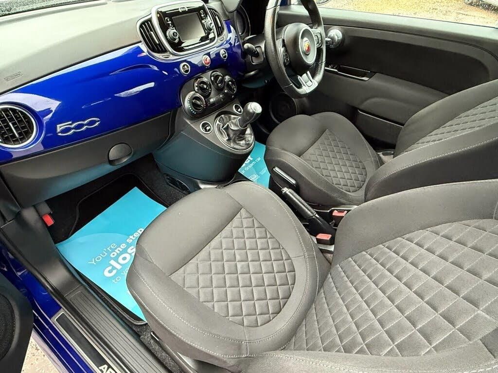 12V Power Point, 16in Alloy Wheels - 8-Spoke Anthracite, 70th Anniversary Side Badge, 7in TFT Instrument Cluster with Sports Mode, ABS - Anti-Lock Braking System, Airbags - Driver, Airbags - Drivers Knee, Airbags - Front Side, Airbags - Passenger, Airbags - Window, Body Coloured Mirrors with Electric Adjustment, Central Locking - Remote, EBD - Electronic Brakeforce Distribution, Electric Windows - Front, Electrically Assisted Power Steering - DUALDRIVE with Sport Mode, Electronic Stability Control-ASR-Hill Holder, Fix and Go Puncture Repair Kit, Front Bumper with Honeycomb Grille and Embossed Abarth Logo, Front Fog Lights, Front Suspension with Frequency Selective Damping technology, LED Day Running Lights - DRL, Matt Black Front and Rear Bumper Insert, Poly-Elliptical Headlights, Racing Steel Pedals, Satin Chrome Finished Handles and Badge Surrounds, Seats - Height Adjustable - Front, Split Folding 50:50 Rear Seat, Sports Leather Steering Wheel with Controls and Satin-Chrome Detailing, Steering Wheel - Height Adjustment, TPMS - Tyre Pressure Monitoring System, TTC - Torque Transfer Control, Twin Exhausts with Satin Steel Tailpipes, Uconnect 5in Touchscreen DAB Radio - Bluetooth with 6 Speakers Audio Streaming and USB, Uconnect Live Services, Podium Blue