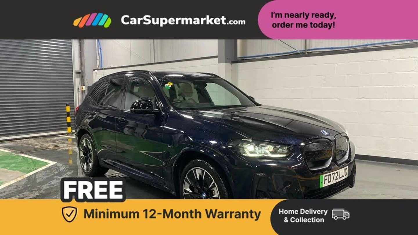 Active guard plus incl speed limit assist, lane departure warning with steering impulse and front collision warning with brake intervention,Apple car play and Android auto,Attentiveness assist,Automatic tailgate operation with remote opening and closing by key, opening distance adjustable with iDrive controller,BMW Drive recorder,BMW gesture control,BMW iDrive,BMW Live Cockpit Professional with 12.3" instrument display + 12.3" high resolution centre display nav function and Intelligent Voice Assistant,BMW Online services,BMW Teleservices,Brake pad wear indicator,Check control system,Comfort access system with smart opener,Condition based service - BMW service history, electronic service booklet, integrated owner's handbook,ConnectedDrive Services,Cruise control with brake function + speed limiter,Driving experience switch,Enhanced bluetooth with wireless charging,Front/rear Parking distance control,Head up Display,Language version English,Lateral parking aid,Parking assistant plus with 360 degree surround view camera system and remote 3D view,PAS,Personal Profile,Reversing assistant,Run flat indicator,Servotronic system,Start/stop button in blue,Wi-Fi hotspot,Widescreen display,Double joint spring strut front axle,eDrive exterior sound,Gear selector switch with toggle operation,Mode 2 flexible charger,Mode 3 charging cable 22kW,Multiple control arm rear axle,Safety battery terminal clamp,2x USB sockets in front,BMW iconic sound electric,DAB radio,Harman/Kardon surround sound audio system,Acoustic front side windows,Acoustic windscreen,Air breathers with BMW i logo,Automatic headlights,Black kidney frame,Blue ring around BMW logos,BMW i badge on the kidney grille,BMW Individual high gloss shadow line with extended contents,Body colour door handles,Body coloured bumpers,Dynamic brake lights,Electric windows with trap release and convenient opening/closing feature,Extended high gloss shadow line exterior trim,Exterior mirror housing finished in body colour,Exterior mirrors electrically adjustable, foldable, heated with memory, auto-dimming drivers side and aspherical on passengers side,Follow me home headlight function,Front and rear bumper system with replaceable deformation elements,Full LED rear lights,Green tinted heat protection glazing glass,Headlight beam throw control,Heated washer jets,High beam assistant,High gloss black shadow line roof rails,High gloss shadowline exterior trim,Integrated direction indicators,LED third brake light,M aerodynamic exterior,M badging on the front side (left and right),M design rear apron with high-gloss black inlays with Frozen grey trim panel,M Sport entry door sill strips,M Sport front bumper with iX3 specific design with blue contents,Metallic paint,Mirror base in black matt,Model logo on left tailgate,Model specific design elements - Frozen grey decorative elements and pearl chrome decorative strip,Panoramic glass sunroof, two parts, electric actuation, sliding function, wind deflector, sun protection with floating headliner,Rain sensor and automatic driving lights control,Rear diffuser in Blue,Rear side wing doors,Rear wiper,Reversing light,Sun protection glass,Visible VIN plate,Welcome lighting,12V power socket in front centre console,2 cupholders in front centre console,3 zone automatic air conditioning,4 way electrically adjustable lumbar support for drivers seat,40:20:40 split folding 3 bench rear seats in 2nd row,6 pre-defined selectable light designs in various colours with contour and ambient lighting,Ambient centre stack lighting,Ambient instrument panel lighting,Ambient light design projected onto the left and right entering and exiting area,Anthracite headlining,Blue accent around the logo on the steering wheel,Centre console storage tray,Contour lighting front and rear door trim panel,Driver and front passenger heated seats,Driver seat backrest width adjustment,Driver/passenger sunvisors with ticket holders + vanity mirrors,Front and rear ambient footwell lighting,Front and rear door pockets with bottle holders,Front and rear headrests,Front armrest integrated in door trim with centre console includes storage compartment,Front Sports electric seats with Driver's side electric backrest width adjustment and memory,Glove compartment,Heated steering wheel,Height and length steering column adjustment,Isofix rear child seat preparation,Lashing eyelets in luggage compartment,LED ambient lighting,Luggage compartment lighting,Luggage net,M sport leather steering wheel,Multifunctional sport seats for driver and front passenger,Presetting of ambient lighting in BMW iblue,Rear centre armrest with 2 cupholders,Seat backrest adjustment for rear seat,Single front passenger seat,Vernasca leather upholstery,Connected pro pack - iX3,Driving assistant professional package - iX3,Extended storage pack - iX3,Interior and exterior mirror pack - iX3,Non-smoker package,ABS/EBD,Active protection,Airbags - driver and front passenger,BMW emergency call