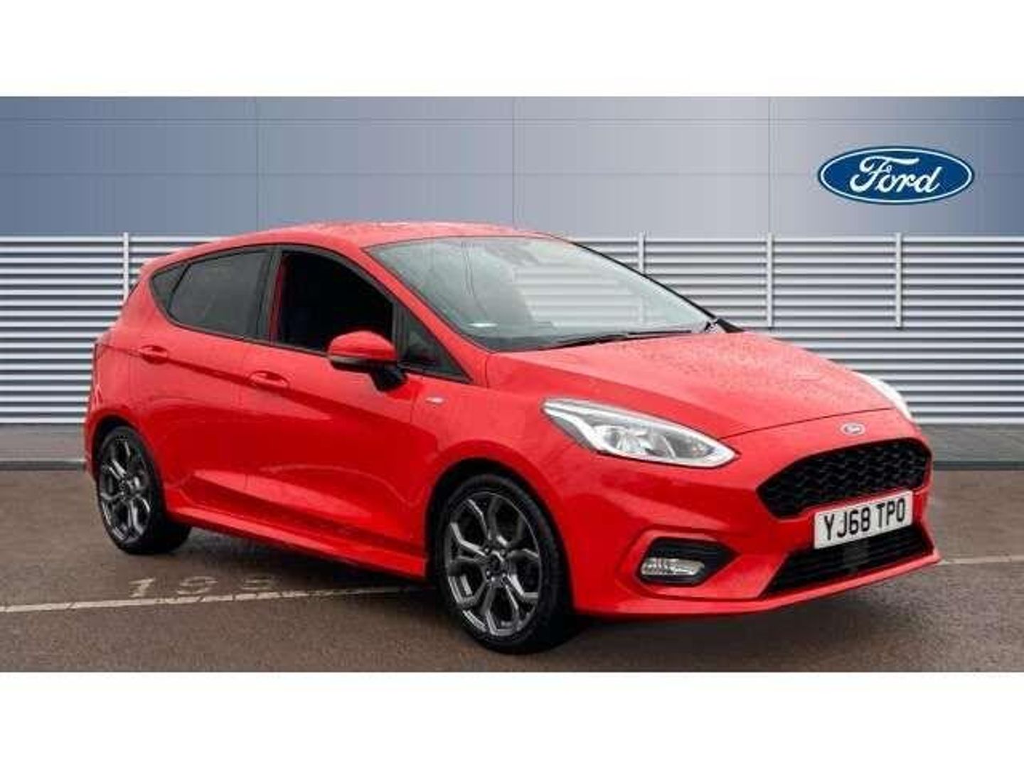 red interior.Bluetooth system, Electric power steering, Ford easy fuel, Trip computer, Sports suspension, 2 USB ports, Auxiliary input socket, Steering wheel mounted controls, USB connection, Automatic headlights, Body colour bumpers, Body colour door handles, Body colour electric adjustable heated door mirrors with integral indicators, Body colour large rear spoiler, Chrome door handles, Chrome lower window surround, Cornering front fog lights, Electric front windows/one touch facility, Quickclear heated windscreen, Rear wiper, Rugged body styling kit with active front wing badges, Tinted glass, Unique ST-Line upper grille & full bodystyling kit with ST-Line wing badges, 12V Accessory socket in centre console, 3 spoke flat bottomed leather steering wheel, 60/40 split folding rear seat, Adjustable head restraints, Black headlining, Boot carpet, Centre console with armrest and illuminated cupholders, Chrome inner door handles, Cloth upholstery, Footwell illumination, Front and rear velour floor mats, Front map reading lights, Front seat and rear pockets, Height adjustable driver's seat, Illuminated glovebox, Leather gear knob, Leather trimmed handbrake handle, Load area light, Manual air conditioning, Overhead console with sunglasses holder, Pollen filter, Rake/reach adjustable steering wheel, Rear centre head restraint, Sports front seats, Sports pedals, NCAP Pack - Fiesta, 3 point seatbelts on all rear seats, ABS+EBA, Curtain airbags, Driver and passenger airbags, Drivers knee airbag, Electronic stability control with hill start assist, Front passenger airbag deactivation, Front side airbags, Seatbelt warning, Tyre pressure monitoring system, Keyless start with 'Ford Power' starter button, MyKey system, Remote central locking & engine immobiliser, Thatcham Cat.1 alarm,
