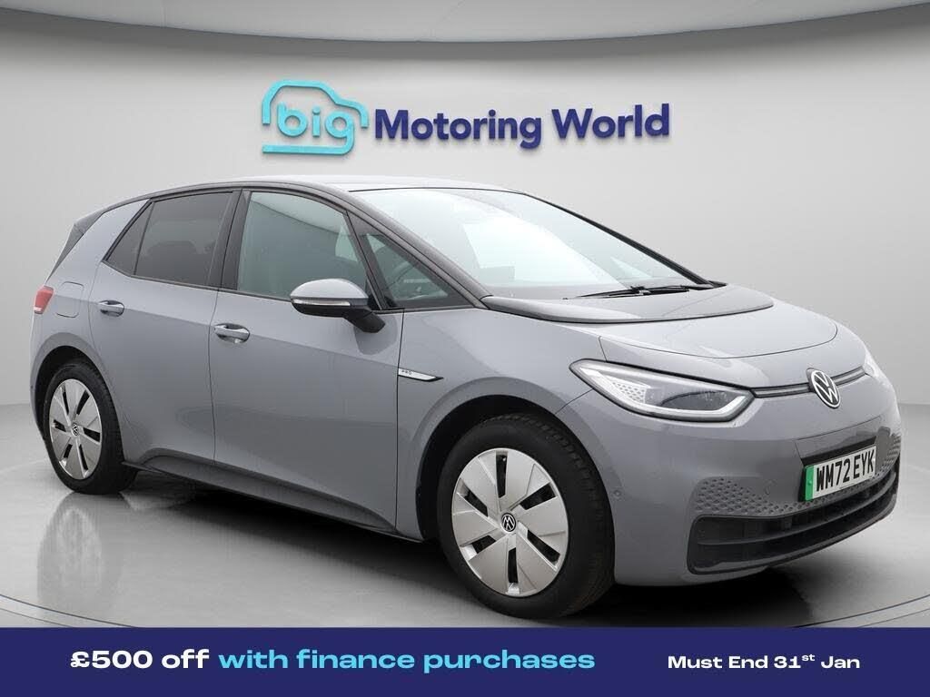 £500 towards your finance depo-Our Volkswagen ID.3 is finished in Grey. Specification includes a range of fantastic features including £500 towards your finance deposit, Apple CarPlay, Adaptive Cruise Control, Lane Assist, Privacy Glass, Gesture Control, Rear View Camera, Internet, Bluetooth, Blind Spot Assist Specification information is supplied by CAPHPI and may vary to the actual car. This data does not form any part of a buying contact. Please check specification prior to purchase in-store. The MOT is valid until January 2027, visit bigmotoringworld.co.uk for more photos, a 360 tour, service history and a free HPI report.Were BIG on peace of mind and this Grey Volkswagen ID.3 has completed our comprehensive 200 point inspection and passed all checks. Its ready for you to drive away with immediate collection in-store. We include a 90-day warranty as standard plus an option to extend for up to 3 years.Reserve this car exclusively for you, safely and securely at bigmotoringworld.co.uk, with a fully refundable £99 deposit. Test drive before you buy, with no commitment, no hassle and a completely haggle free experience. Still searching and want to see thousands more cars? We are BIG on choice with over 8000 cars to choose from.Visit our award winning web site bigmotoringworld.co.uk.Were Big Motoring World and were BIG on what matters to you.