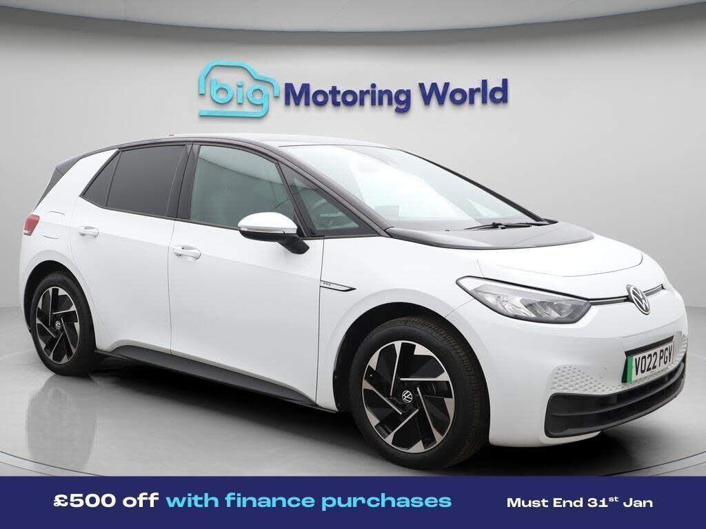 £500 towards your finance depo-Our Volkswagen ID.3 is finished in White. Specification includes a range of fantastic features including £500 towards your finance deposit, Apple CarPlay, Adaptive Cruise Control, Lane Assist, Android Auto, Privacy Glass, Heated Seats, Heated Steering Wheel, Bluetooth, Blind Spot Assist Specification information is supplied by CAPHPI and may vary to the actual car. This data does not form any part of a buying contact. Please check specification prior to purchase in-store. The MOT is valid until February 2027, visit bigmotoringworld.co.uk for more photos, a 360 tour, service history and a free HPI report.Were BIG on peace of mind and this White Volkswagen ID.3 has completed our comprehensive 200 point inspection and passed all checks. Its ready for you to drive away with immediate collection in-store. We include a 90-day warranty as standard plus an option to extend for up to 3 years.Reserve this car exclusively for you, safely and securely at bigmotoringworld.co.uk, with a fully refundable £99 deposit. Test drive before you buy, with no commitment, no hassle and a completely haggle free experience. Still searching and want to see thousands more cars? We are BIG on choice with over 8000 cars to choose from.Visit our award winning web site bigmotoringworld.co.uk.Were Big Motoring World and were BIG on what matters to you.