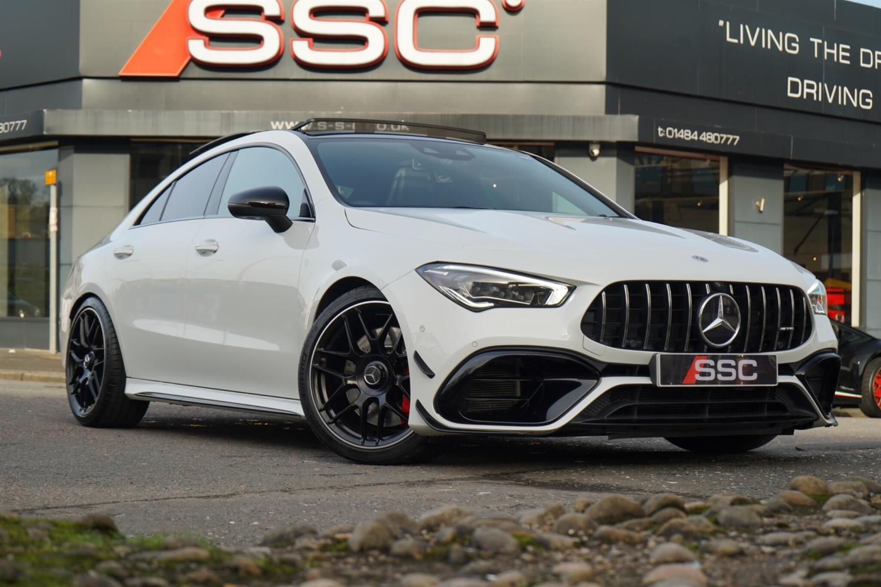 Stunning CLAA45 AMG S PLUS Finished In White With Black AMG Exclusive Nappa Leather Interior. Fantastic Spec Inc: AMG Aero Pack, 19'' AMG Cross Spoke Alloys In Matt Black, AMG Night Pack, Valvetronic AMG Exhaust, Panoramic Sunroof, Burmester Surround Sound, AMG Drivers Package, AMG Leather Package, AMG Track Pace, Widescreen Cockpit, COMAND Online, Wireless Charging, Quad AMG Exhaust Tips, Active Lane Keeping Assist, Blind Spot Assist, Exit Warning Assist, Red AMG Calipers, Cruise Control with Limiter, DAB, Thermotronic Luxury Climate, Dual Bluetooth Interfaces, Electric Heated AMG Performance Seats With Memory, Electric Folding Mirrors With Memory, Auto Dimming Mirrors, Keyless System, Illuminated Door Sill Trims, Multibeam LED Headlights, Adaptive Highbeam Assist Plus, Multi-Contour Seat Package, Light and Sight Package, Parking Pack, Privacy Glass, Speed Limit Assist, Traffic Sign Assist, Tyre Pressure Monitoring System, 64 Colour Ambient Lighting Programme, Multi Function AMG Performance Steering Wheel. This CLAA45 S Plus Comes With Full Service History.