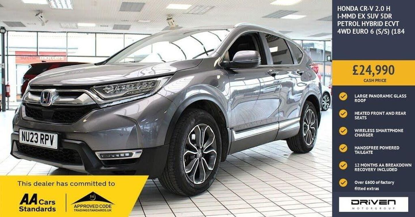HONDA CR-V 2.0 H I-MMD EX SUV 5DR PETROL HYBRID ECVT 4WD FINISHED IN MODERN STEEL AND COMPLIMENTED WITH BLACK LEATHER INTERIOR, THIS VEHICLE HAS BEEN VERY WELL CARED FOR AND MAINTAINED WITH DOCUMENTED SERVICE HISTORY CARRIED OUT AT 11915, 25399 MILES PLUS COMPREHENSIVE PRE DELIVERY HEALTH CHECK COMPLETED PRIOR TO SALE AT 32246 MILES. KEY FEATURES INCLUDE ALLOY WHEELS, ADAPTIVE CRUISE CONTROL, SPEED LIMITER, AMBIENT LIGHTING, AUTO DIMMING REAR VIEW MIRROR, AUTOMATIC HEADLIGHTS, DUAL ZONE CLIMATE CONTROL, DAB RADIO, DRIVE MODE, FOLDING ELECTRIC DOOR MIRRORS, HEATED FRONT AND REAR SEATS, HANDSFREE POWERED TAILGATE, HONDA CONNECTION WITH GARMIN SATALLITE NAVIGATION, BLUETOOTH WITH HANDSFREE, LANE ASSIST, MULTIFUNCTIONAL DISPLAY, PADDLESHIFT CONTROLS, OPEN GLASS PANORAMIC ROOF, FRONT AND REAR PARKING SENSORS WITH REAR VIEW CAMERA,, HEATED STEERING WHEEL, WIRELESS CHARGING PLUS MUCH MORE. COMMITTED TO AA CARS STANDARDS: 3 MONTHS OR 3000 MILES WARRANTY INCLUDED WITH AN OPTION TO UPGRADE: 12 MONTHS AA BREAKDOWN RECOVERY INCLUDED: £75.00 CONTRIBUTION TOWARDS YOUR NEXT SERVICE/MOT AT ANY AA CARS STANDARD APPROVED WORKSHOP: WE STAND BY THE QUALITY OF OUR VEHICLES. WITH THE PURCHASE OF THIS VEHICLE, YOU WILL RECEIVE 3 MONTHS OR 3000 WARRANTY, 12 MONTHS AA BREAKDOWN RECOVERY, GIVING YOU ADDITIONAL PEACE OF MIND AND PROTECTION. ALL OUR CARS COME WITH AT LEAST 6 MONTHS MOT AND PRE SALE HEALTH CHECK AND ROAD TEST. OUR PROFESSIONAL TEAM ENSURES YOUR VEHICLE STAYS IN TOP CONDITION, AND YOU ENJOY A HASSLE-FREE OWNERSHIP EXPERIENCE. 4.7 STARS ON GOOGLE WITH OVER 550 REVIEWS: JOIN OUR COMMUNITY OF SATISFIED CUSTOMERS! OUR DEALERSHIP IS PROUD TO HAVE A 4.7 STAR RATING ON GOOGLE, BACKED BY OVER 550 POSITIVE REVIEWS. WE ARE COMMITTED TO PROVIDING EXCELLENT SERVICE AND HIGH-QUALITY VEHICLES. This Vehicle Comes Equipped with High Specification, Which Includes: - Drive this car home with complete confidence and satisfaction: All cars proudly offered by driven group are rigorously inspected, hpi checked and prepared to the highest standard To drive this car home, visit www.drivegroup.co.uk or call 01642-601999 to arrange an appointment with our sales team Please note we do not operate an organised distance selling scheme as defined by the consumer contracts (cancellation, information and additional charges) regulations 2013. Therefore, even if you choose to not view your vehicle at our premises prior to purchase,you will not be entitled to cancel your order under any 14 day cancellation period. All other statutory rights remain unaffected. Whilst every effort has been made to ensure the accuracy of the information contained in this website, please check with us about any item which may affect your decision to purchase. Driven motor group shall not be liable for any errors, inaccuracies or delays in content.
