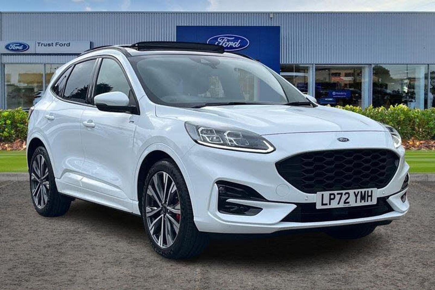 12.3 digital colour instrument cluster, Ford easy fuel, Ford SYNC 3 with 8 TFT LCD touchscreen, App Link, andriod auto/apple carPlay, emergency assistance and navigation with Ford pass connect, Front and rear parking sensors, Hands free power tailgate, Lane keeping aid with lane departure warning, Power assist steering, Rear view camera, Selectable drive modes, Service interval indicator, Auto headlamps with high and low beam, Black roof rails, Body colour bumpers, Day/night rear view mirror, Front LED fog lamps, Large rear roof spoiler, LED daytime running lights, LED rear lights, Power folding, electrically adjustable and heated door mirrors with puddle lights, Power front/rear windows with global close, Power opening panoramic roof, Quickclear heated windscreen, Rain sensing wipers, Rear privacy glass, Rear side wing doors, Rear wiper, ST Line body styling kit with unique front and rear fascia and bumper, rear painted diffuser, front painted skid plates, dark mesh upper grille, ST Line front scuff plates, Third brake light, Twin exhausts, 2nd row sliding seats with 60:40 split, Alloy pedals, Centre console with electronic parking brake, Dark headlining and pillars, Electronic automatic temperature control (EATC), Flat bottomed leather steering wheel in sensico with red stitching, Front and rear head restraints, Heated passenger and driver seats, Heated rear seats, Heated steering wheel, Partial premium touch Sensico with black cloth inserts and red stitching, Rear centre head restraint, Single front passenger seat, Sports seats, ST Line front and rear floor mats, 3x3 point rear seatbelts, Airbags - front driver/passenger, front and rear curtain, Drivers knee airbag, Electronic stability control (ESC) and ABS, Ford MyKey Gen 2 safety system, Manual child proof rear door locks, Post collision braking, Pre collision assist with autonomous emergency braking, Rear seat Occupancy alert, Red brake calipers, Tyre pressure monitoring system