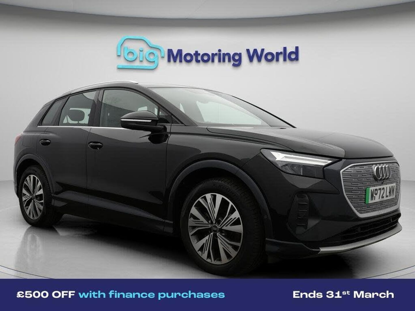 £500 towards your finance depo-Our Audi Q4 e-tron is finished in Black. Specification includes a range of fantastic features including £500 towards your finance deposit, Head up Display, 19'' Alloy wheels, Apple CarPlay, Lane Assist, Android Auto, Satellite Navigation, Heated Seats, Bluetooth, Parking Sensors Specification information is supplied by CAPHPI and may vary to the actual car. This data does not form any part of a buying contact. Please check specification prior to purchase in-store. The MOT is valid until December 2026, visit bigmotoringworld.co.uk for more photos, a 360 tour, service history and a free HPI report.Were BIG on peace of mind and this Black Audi Q4 e-tron has completed our comprehensive 200 point inspection and passed all checks. Its ready for you to drive away with immediate collection in-store. We include a 90-day warranty as standard plus an option to extend for up to 3 years.Reserve this car exclusively for you, safely and securely at bigmotoringworld.co.uk, with a fully refundable £99 deposit. Test drive before you buy, with no commitment, no hassle and a completely haggle free experience. Still searching and want to see thousands more cars? We are BIG on choice with over 8000 cars to choose from.Visit our award winning web site bigmotoringworld.co.uk.Were Big Motoring World and were BIG on what matters to you.