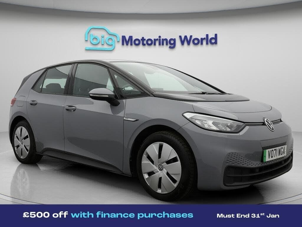 £500 towards your finance depo-Our Volkswagen ID.3 is finished in Grey. Specification includes a range of fantastic features including £500 towards your finance deposit, Apple CarPlay, Lane Assist, Android Auto, Satellite Navigation, Heated Seats, Heated Steering Wheel, Bluetooth, Parking Sensors, Flat Bottom Steering Wheel Specification information is supplied by CAPHPI and may vary to the actual car. This data does not form any part of a buying contact. Please check specification prior to purchase in-store. The MOT is valid until February 2027, visit bigmotoringworld.co.uk for more photos, a 360 tour, service history and a free HPI report.Were BIG on peace of mind and this Grey Volkswagen ID.3 has completed our comprehensive 200 point inspection and passed all checks. Its ready for you to drive away with immediate collection in-store. We include a 90-day warranty as standard plus an option to extend for up to 3 years.Reserve this car exclusively for you, safely and securely at bigmotoringworld.co.uk, with a fully refundable £99 deposit. Test drive before you buy, with no commitment, no hassle and a completely haggle free experience. Still searching and want to see thousands more cars? We are BIG on choice with over 8000 cars to choose from.Visit our award winning web site bigmotoringworld.co.uk.Were Big Motoring World and were BIG on what matters to you.