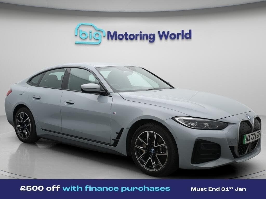 £500 towards your finance depo-Our BMW i4 comes with optional extras worth £695. Specification includes a range of fantastic features including £500 towards your finance deposit, Leather Seats, Connected Package Professional, M Sport Exterior Styling Pack, M Sport Bodykit, Satellite Navigation, Heated Seats, Gesture Tailgate, Rear View Camera, Internet Specification information is supplied by CAPHPI and may vary to the actual car. This data does not form any part of a buying contact. Please check specification prior to purchase in-store. The MOT is valid until February 2027, visit bigmotoringworld.co.uk for more photos, a 360 tour, service history and a free HPI report.Were BIG on peace of mind and this Grey BMW i4 has completed our comprehensive 200 point inspection and passed all checks. Its ready for you to drive away with immediate collection in-store. We include a 90-day warranty as standard plus an option to extend for up to 3 years.Reserve this car exclusively for you, safely and securely at bigmotoringworld.co.uk, with a fully refundable £99 deposit. Test drive before you buy, with no commitment, no hassle and a completely haggle free experience. Still searching and want to see thousands more cars? We are BIG on choice with over 8000 cars to choose from.Visit our award winning web site bigmotoringworld.co.uk.Were Big Motoring World and were BIG on what matters to you.