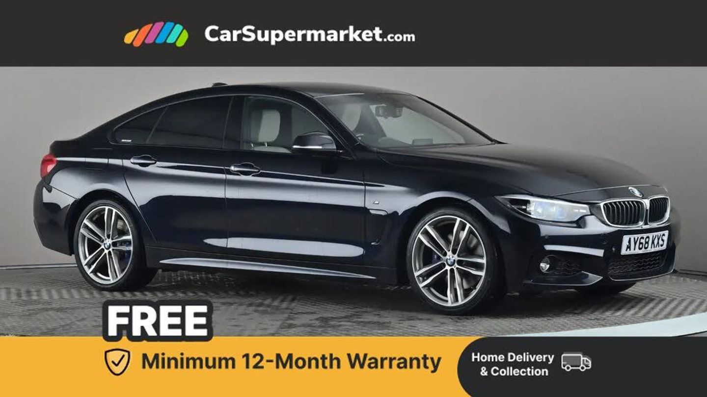 Auto start-stop,Automatic tailgate operation,BMW Online services,BMW remote services,BMW Teleservices,Brake pad wear indicator warning light,Check Control warning system for monitoring of lights and door/luggage compartment open warning,Control display - 6.5" colour display screen,Front/rear park distance control (PDC),iDrive Controller with 8 favourite buttons,Instrument cluster with speedometer with mph readout, tachometer, fuel gauge and oil temperature gauge,Lights on warning by audio warning signal when ignition is switched off,M Sport instrument cluster,On board computer - average speed, fuel consumption, outside temp display with acoustic warning, clock/date, service interval, odometer/trip meter,Optimum shift indicator,Personal Profile - automatic lock when driving away selectable,Run flat indicator,Aluminium front suspension,Diesel particulate filter,Drive performance control with ECO PRO comfort + sport mode,Electronic differential lock,Five link rear suspension,Incorrect fuelling protection,Sport automatic transmission with steering-wheel mounted gearshift paddles and launch control,DAB tuner,Auto dimming rear view mirror,Body colour door handles,Body colour front bumper,Body colour mirror caps,Body colour roof mouldings,Chrome kidney grille with extra wide black, high gloss black vertical slats,Direction indicator, side repeaters, integrated in exterior mirrors,Door sill finishers with M designation,Dual exhaust tailpipes in left with chrome finisher,Dynamic brake lights,Electric front windows with fingertip open/close + anti-trap facility,Follow me home headlights,Front air inlet with high gloss black finish,Front and rear bumper system,Green tinted heat protection glazing,Heated windscreen washer jets,Heated, electrically adjustable exterior mirror aspheric on driver side, convex on passenger side,High gloss black rear bumper insert,High gloss shadow line,High level third brake light,LED daytime running lights,LED direction indicator lenses,LED eyebrow light,LED front fog lights,LED tail lights with 3D L-shaped LED light design,Lightweight engineering,M aerodynamic bodystyling,M designation side badges,Rain sensor including auto headlights activation,Shark fin antenna,Two speed adjustable intervals windscreen wipers,Visible VIN plate,Welcome lighting,Windscreen with grey shadeband,12V sockets in front centre console and passenger footwell,2 Rear seat headrests,3 spoke leather M sport multifunction sports steering wheel,4 grab handles,Air conditioning and radio control panel in high gloss black,Anthracite headlining,Automatic air conditioning with two zone control,Chrome centre console panel highlight,Driver and front passenger seat heating,Folding front centre armrest with storage compartment,Folding storage compartment with glasses holder + coin tray,Front and rear side armrests integrated into door trim,Front door storage with bottle holder,Front head restraints,Front sports seats with electric side bolster adjustment,Glove compartment,Glove compartment opener with chrome trim,Interior lighting, front centre over interior mirror and rear centre automatic interior light activation when door is opened,ISOFIX child seat preparation+airbag deactivation,Leather gearknob and handbrake lever,Load lashing eyes in luggage compartment,Reach + rake adjustable steering column,Rear centre armrest with 2 cupholders,Rear coded belt buckles,Storage compartment in rear centre console,Sunvisors with vanity mirrors and ticket pocket,Toolkit located in luggage compartment,Two front cup holders with a sliding lid,Extended lighting package - 4 Series Gran coupe,Media pack - Professional - 4 Series M Sport,Airbag - Front driver and passenger, front and rear head, front side, curtain head protection, manual deactivation of front passenger airbag possible,Anti lock braking system (ABS) with brake assist,Automatic Stability Control (ASC),Battery safety cut-off,BMW emergency call,Brake drying,Brake energy regeneration,Brake pretensioning,Cornering brake control (CBC),Crash sensor activating central locking release, hazard warning lights,Dynamic brake control,Dynamic stability control + (DSC+),Dynamic Traction Control - DTC,Front and rear ventilated brake disc,Front seatbelt force limiters,Hill start assistant,Pyrotechnically pre-tensioned front seatbelts,Seat belt security check for driver,Side impact protection,Twin horns,Tyre pressure monitoring with three level warning strategy,Variable torque distribution,Warning triangle and first aid kit,Central locking switch for all doors, fuel filler cap and luggage compartment,Electronic engine immobiliser,Remote control integrated key with blue inset,Start/stop button with Comfort Go keyless engine start and auto Start/stop deactivation button,Thatcham category 1 alarm,Reduced rolling resistance tyres,Run flat tyres,19in Alloy Wheels - M Double Spoke Style 704M,Carbon Black,Dakota Leather - Ivory White with Black Interior,High-Beam Assistant