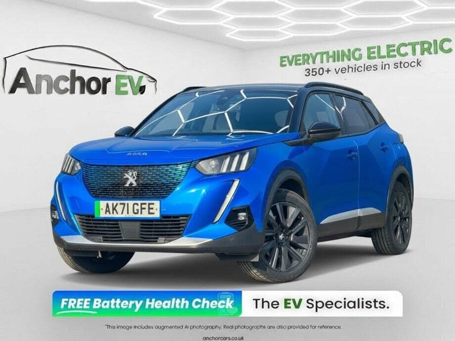 Cloth interior.Anchor EV is proud to present this 2021 Peugeot e-2008 GT Premium, a stylish and fully electric compact SUV that combines modern design with zero-emissions driving. Finished in an eye-catching blue, this five-door e-2008 offers a confident and contemporary road presence, enhanced by its premium GT styling and SUV-inspired stance. Powered by a 50kWh electric motor paired with an automatic transmission, this Peugeot delivers a smooth, quiet and responsive driving experience. Producing 136 ps, it offers strong everyday performance with instant torque, making it particularly well suited to urban driving and longer journeys alike. The electric powertrain provides refined progress with the added benefit of low running costs and emissions-free motoring. Inside, the cabin offers a high-quality, modern environment with a driver-focused layout and a strong sense of comfort. The elevated seating position, generous interior space and five-door practicality make it an excellent choice for families or professionals seeking a versatile electric vehicle.