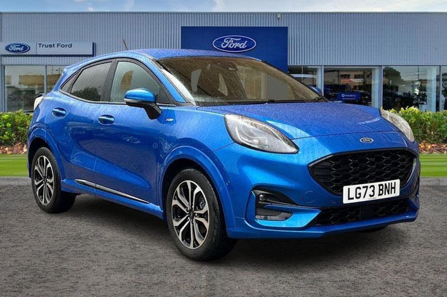 Driver impairment monitor, Emergency call service, Ford easy fuel, Full digital 12.3 instrument cluster, Lane keeping aid with lane departure warning, Power assist steering, Power start button, Rear parking sensor, Selectable drive modes(Normal, Eco, Sport, Slippery and Trail), Speed sign recognition, Automatic headlights with auto high beam, Automatic rain sensing wipers, LED rear lamps, Power foldable heated door mirrors with puddle lamps, Projector headlamps with LED day time running lights and front fog lamps, Quickclear heated windscreen, Rear side wing doors, Rear wiper, ST-Line body styling kit with unique grille, Third brake light, 3 seat bench in 2nd row, Centre console with armrest and stowage, Ford megabox extended bootspace, Front and rear head restraints, Front floor mats, Manual 2 way passenger seat adjustment, Manual 4 way driver seat adjust with lumbar adjustment, Single front passenger seat, ST- Line cloth trim with red stitching, ST-Line flat bottomed sensico leather steering wheel with leather handbrake and aluminium gear knob, 3 rear seatbelts, Child safety lock, Electronic stability control (ESC) and hill start assist, Pedestrian/cyclist detection & post-collision braking, Pre collision assist system, Tyre pressure monitoring system (TPMS)