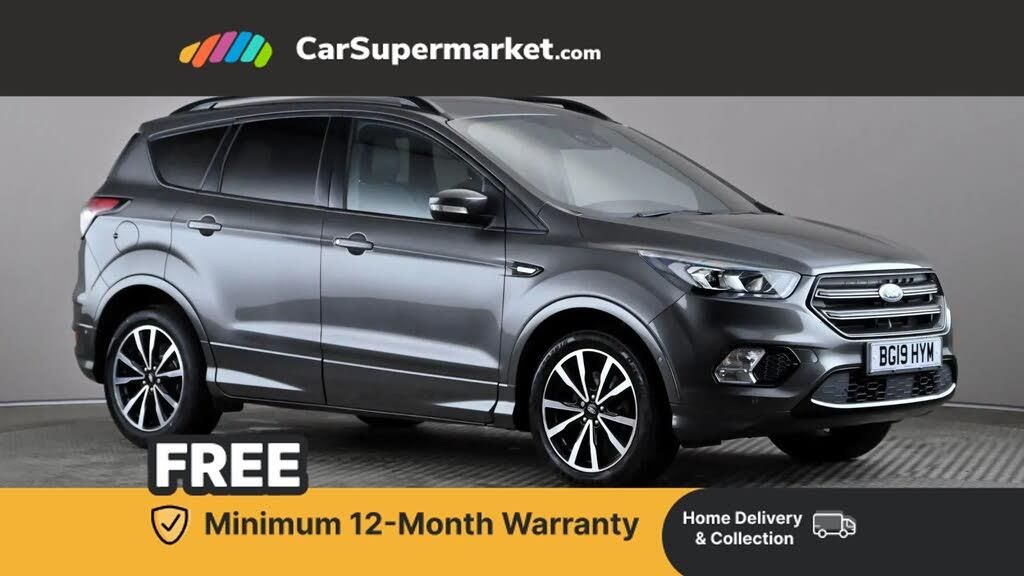 Apple car play/Android Auto,Enhanced active park assist including perpendicular parking pull out assist, flank guard and front/rear parking sensor,EPAS,Hands free telephone,Trip computer,Sports suspension,2 USB ports,Auxiliary socket for external device,Remote audio controls on steering wheel,Auto dimming rear view mirror,Body colour bumpers,Body colour rear spoiler,Body styling kit - Body colour front/rear/side skirts, door claddings, wheel arches, high gloss black rear mesh, silver skid plate and rear diffuser,Electrically operated and heated door mirrors with side indicators,Electrically operated front and rear windows with global closing,Front fog lights,Front scuff plate,Power folding door mirrors,Quickclear heated windscreen,Rain sensing wipers,Tailgate wash/wipe,Twin exhaust pipes,6 way manually adjustable driver's seat with lumbar support,6 way manually adjustable passenger seat with lumbar support,60/40 split/folding rear back and cushion,Alloy Foot Pedals,Auxiliary power socket in luggage area,Centre console with stowage tray/bottle holder/CD stowage/front and rear 12V power point,Dark headliner,Driver/passenger front seatback pockets,Dual electronic automatic temperature control,Flat bottomed leather steering wheel with red stitching + gear knob,Folding rear centre armrest,Footwell courtesy lights front and rear,Front head restraints,Front overhead courtesy lights with theatre style dimming and delay,Front/rear reading lights,Gearshift paddles,Isofix system on outer rear seats,Part leather upholstery,Reach + rake adjustable steering column,Rear head restraints,Sports style front seats,Stowage unit in upper instrument panel,Tie down hooks,Tonneau cover,Variable intensity instrument illumination,Appearance pack - Kuga/ST-Line,3 point seatbelts on all 3 rear seats,ABS/EBD,Airbags - front driver/passenger, front & rear side, curtain, drivers knee,EBA,Electric traction assist system,Electronic Stability Programme,Front passenger airbag deactivation switch,Hill start assist,Intelligent Protection System (IPS),Tyre pressure monitoring system,Engine immobiliser,Keyless entry,Keyless start with 'Ford Power' starter button,Locking wheel nuts,MyKey system,Remote powered central double locking doors,Thatcham category 1 alarm,Mini steel spare wheel