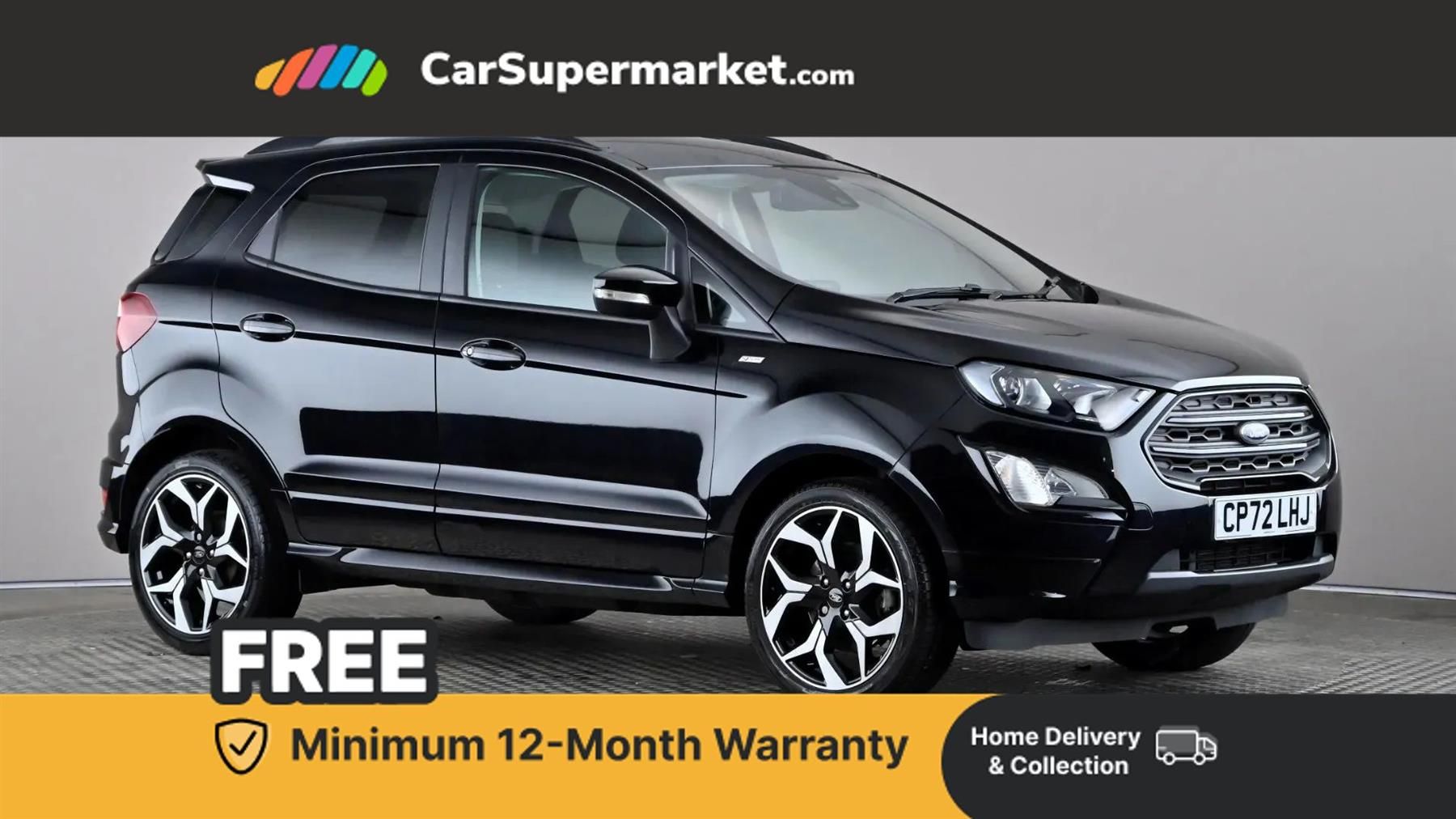 Cruise Control, Parking Sensors, Traffic Sign Recognition, Apple CarPlay, Android Auto, Privacy Glass, Keyless Entry;Black ST-Line X EcoSport with cruise control, parking sensors, traffic sign recognition, Apple CarPlay, Android Auto, privacy glass, and keyless entry. Optional extras include X-Pack, Shadow Black 18-inch alloy wheels, Agate Black paint, and partial Sensico/Neosuede interior, valued at £1,775. Last serviced on 10 January 2025 - services are due every 24 months. MOT due 26 January 2027.