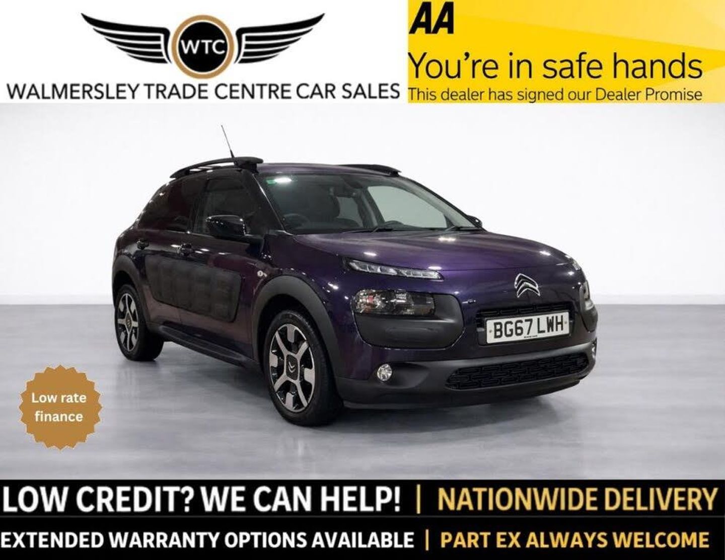 This Citroen C4 Cactus Flair is a fantastic choice for anyone looking for a practical, reliable and eye-catching hatchback with great running costs and a high driving position. Finished in a stunning Purple, it stands out from the crowd while still being a comfortable and easy car to live with day to day. The 1.2 PureTech petrol engine offers a smooth drive, ideal for both city use and longer journeys, with excellent fuel economy and low emissions. Inside, the Flair specification provides a great level of comfort and technology, including Climate Control, a built-in Navigation System, and Parking Sensors to make manoeuvring simple. The exterior is finished off perfectly with 17" Alloy Wheels and Privacy Glass, giving it a smart and modern look. Full Service History 9 Service Stamps 2 Keys Logbook Present Temporary Spare Wheel Included A brilliant all-round hatchback with great spec, stylish looks and excellent practicality. Walmersley Trade Centre Trusted Motor Trade Experts With over 27 years experience and proudly operating since 2011, we are committed to quality, transparency, and outstanding customer satisfaction. All vehicles are fully HPI checked and clear, supplied with 12-month AA Breakdown Cover, and come with flexible warranty options for added peace of mind. We offer competitive finance packages to suit every budget, including: PCP available on vehicles up to 12 years old at the end of the agreement Finance available on vehicles up to 15 years old (older considered on a case-by-case basis) Personal loan options ideal for top-up loans or negative equity Finance available for customers with international driving licences or less than 12 months UK residency Part exchange always welcome. Call our friendly, knowledgeable team on 0161 637 7280 to book a test drive and experience the Walmersley difference. Please note: prices may be subject to an admin fee contact us for full details.