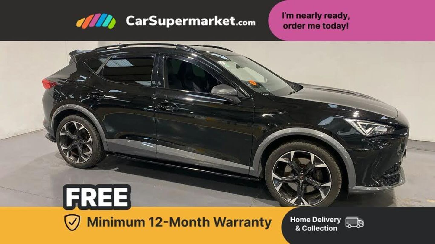 Digital cockpit and configurable dashboard,Driver alert system,Dynamic chassis control with driving profile selection (Comfort, Sport, CUPRA, Individual),E-call,Forward collision warning with automatic braking,Lane assist,Park assist (inc front/rear parking sensors),Predictive adaptive cruise control with speed limiter,RPM, trip computer, outside temp gauge, instrument light brightness, low fuel warning light, lights on reminder, gearshift indicator,Service interval indicator,Speed sensitive power steering,Start/stop system with regenerative braking,Virtual pedal and electric tailgate,Wireless apple carplay,Wireless phone charger,10 amp mode 2 charging cable,16 amp mode 3 charging cable,3.6 kw On-board charger,Electronic locking differential and dynamic traction support,Sports suspension with front shock absoption,2 front and 2 rear USB type C sockets,6 speakers,Auxiliary input socket,DAB radio,Auto dimming rear view mirror,Body colour door handles,Body coloured bumpers,Dark grey wing mirror,Daytime running light with automatic headlight control and coming home feature,Dynamic headlight range control,Electric front/rear windows,Electrically adjustable heated and folding door mirrors with memory function,Front fog lamps with cornering function,Gloss black roof rails and window surrounds,LED Headlights,LED Taillights with dynamic indicator,Rain sensing wipers,Rear diffuser with twin exhaust pipe on each side with simulated exhausts,Rear side wing doors,Rear wash/wipe,Sports bumpers,Third brake light,Tinted rear windows,Welcome lights,12v power supply in centre console,12V socket,12v socket in loadspace,2 front and 2 rear reading lights,230V socket,3 seat bench in 2nd row,60/40 split rear bench seat with armrest and mechanical seat release,Black headlining,Cupra sports pedals,Dust/pollen filter,Front and rear head restraints,Front centre armrest,Height/reach adjust steering wheel,Illuminated interior front door sills,Illuminated sunvisor with mirror,Isofix,Leather heated multi-function sports steering wheel with start stop, CUPRA mode button and gear shift paddles,Luggage tie-down hooks,Single front passenger seat,Three zone climate control with control panel in rear,Wraparound lighting,Genuine Nappa leather Pack - Cupra,Navigation system pack - Formentor,Safety and driving pack (XL) - Formentor,3 point seatbelts on all rear seats,ABS,Brake control system - ESC and brake booster,Child proof door locks,Driver and front passenger airbags with front passenger airbag de-activation,Electronic parking brake,Front and rear disc brakes,Front side curtain airbags,Hill hold control,Seat belt reminder for front and rear seats,Tyre pressure monitoring system,Anti theft alarm system,Keyless entry and start system (KESSY),Locking wheel bolts,Copper and aluminium interior detailing,19" 'Exclusive' machined sport matte black and silver alloy wheels,Tyre repair kit
