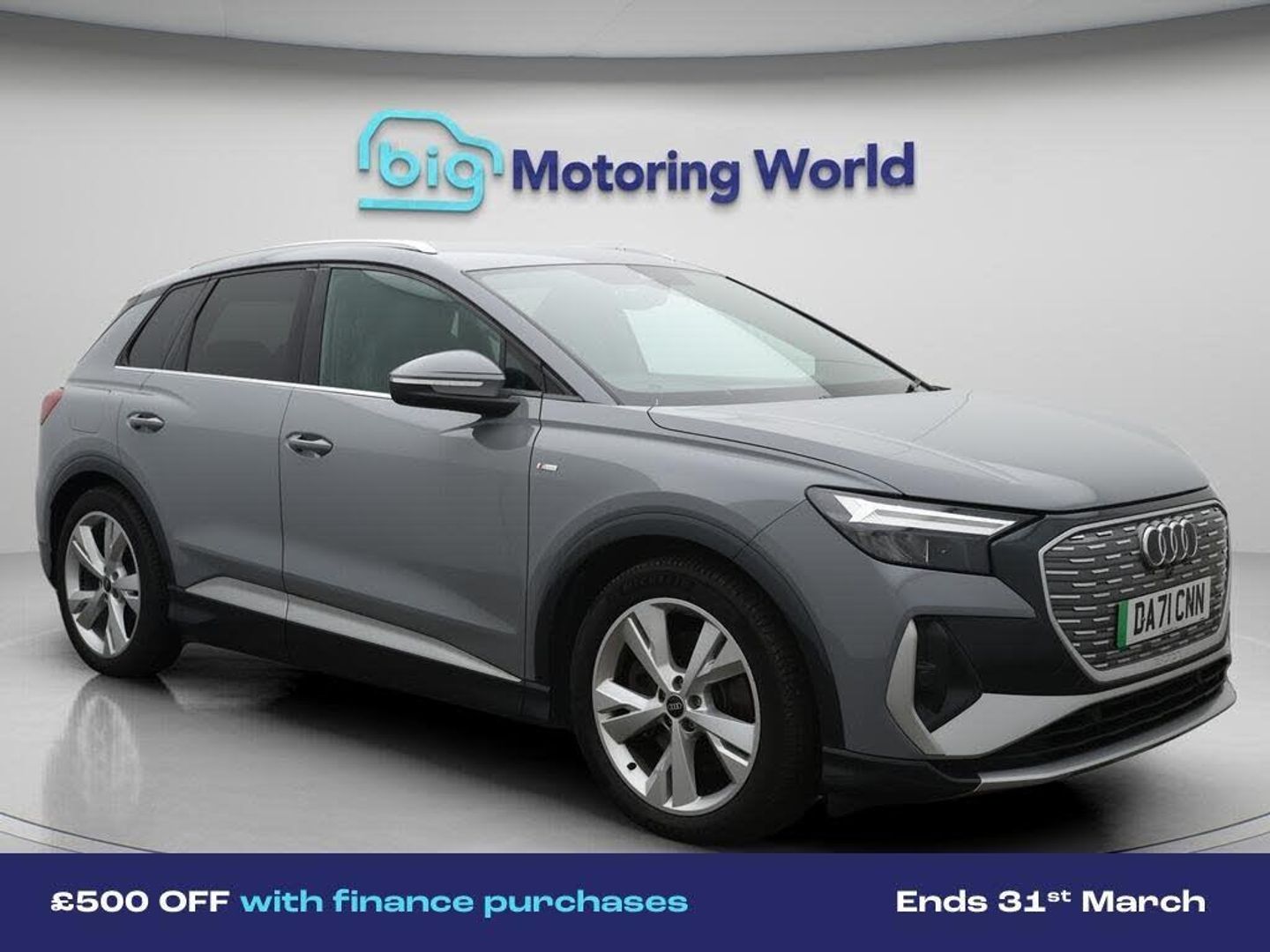 £500 towards your finance depo-Our Audi Q4 e-tron is finished in Grey. Specification includes a range of fantastic features including £500 towards your finance deposit, Leather Seats, Apple CarPlay, Lane Assist, Android Auto, Satellite Navigation, Privacy Glass, Heated Seats, Rear View Camera, Bluetooth Specification information is supplied by CAPHPI and may vary to the actual car. This data does not form any part of a buying contact. Please check specification prior to purchase in-store. The MOT is valid until November 2026, visit bigmotoringworld.co.uk for more photos, a 360 tour, service history and a free HPI report.Were BIG on peace of mind and this Grey Audi Q4 e-tron has completed our comprehensive 200 point inspection and passed all checks. Its ready for you to drive away with immediate collection in-store. We include a 90-day warranty as standard plus an option to extend for up to 3 years.Reserve this car exclusively for you, safely and securely at bigmotoringworld.co.uk, with a fully refundable £99 deposit. Test drive before you buy, with no commitment, no hassle and a completely haggle free experience. Still searching and want to see thousands more cars? We are BIG on choice with over 8000 cars to choose from.Visit our award winning web site bigmotoringworld.co.uk.Were Big Motoring World and were BIG on what matters to you.
