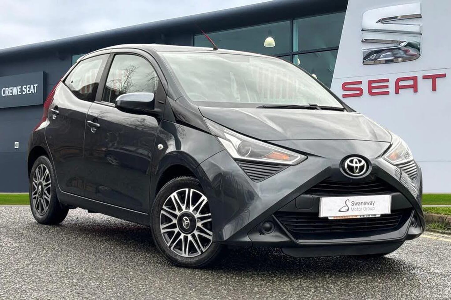 The Toyota AYGO 1.0 VVT-i x-play Euro 6 5dr in grey is a stylish and practical city car that offers a great mix of comfort, technology, and efficiency. Inside, it features a smart 3 spoke leather steering wheel with audio and telephone controls, along with a leather gear shift and chrome detailing on the gear shift and interior door handles for a modern touch. The 7 inch x touch multimedia system includes Bluetooth connectivity and a USB connection, making it easy to stay connected and enjoy your favourite music on the move. Comfort is enhanced with manual air conditioning, electric front windows, and electrically adjustable heated door mirrors. Safety and convenience features include Hill Start Assist Control, electronic headlight levelling, a reversing camera, and LED daytime running lights with rear LEDs for improved visibility. Additional practical touches such as a rear window demister, integrated rear spoiler, clean air filter, central console storage pocket, and a tyre repair kit make this AYGO a reliable and well-equipped choice for everyday driving. This vehicle is compliant with the Ultra Low Emission Zone (ULEZ) standards!