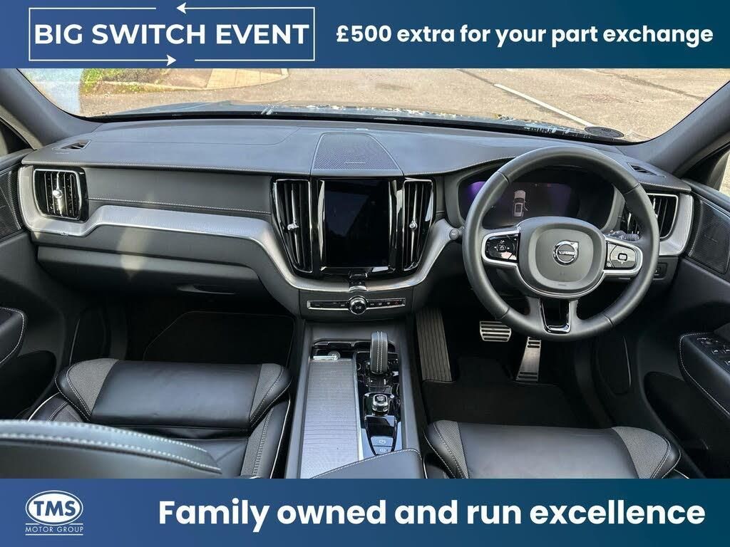Black Stone, Charcoal Leather, Sunroof, Adaptive Cruise Control, Power Driver's Seat with Memory for Seat, Premium Sound by Harman Kardon, Driver assistance, Heated Front Windscreen, Retractable Towbar, 4 Zone Climate, Please call on 0116 275 8800, 8-speed Automatic transmission. AWD, Sport Pedals, Tailored leather gear shift with contrasting seams, 4-Zone Electronic Climate Control, Afterrun parking climate, Passenger Airbag Cut Off Switch, Dual Stage Driver and Passenger Airbags, Driver Knee Airbag, Panoramic Roof, Charcoal headlining, Road Sign Information, Driver Alert Control with Lane Keeping Aid, R-Design grille with high-gloss black insert, Heated grill emblem, Full-LED headlights, Headlight Cleaning System, Front LED Foglights, 12-inch driver display, Google Automotive Services, Pilot Assist (up to 80mph) Adaptive Cruise Control with Distance Alert & Queue Assist, Driver Assistance (Pilot Assist and Adaptive Cruise Control), Adjustable Speed Limiter, Fresh Air Subwoofer, DAB (Digital Audio Broadcasting) Radio, Premium Sound by Harman Kardon, Autofolding Heated Power Door Mirrors, Memory for Passenger Seat, Automatic door locking, Door mirror covers. Black Stone, Dark Tinted Rear Windows, Anti-theft Alarm including Immobiliser. Volume Sensor and Level Sensor, Power Operated Tailgate, Keyless Drive (includes Keyless Entry and Keyless Start), CleanZone with advanced air cleaner PM 2.5, Digital owners manual, Metal Mesh aluminium decor, Tailored dashboard, Nappa leather/Leatherette/Textile upholstery, Power Driver's Seat with Memory for Seat, Power Passenger Seat, Heated Front Seats, Heated Rear Seats - Outer Positions, Power Folding Rear Seat Headrests, Five seats, Mechanical release second seat row, 4-Way Lumbar Support, Sport Textile Mats. Charcoal, Load Protection Net, Rear centre armrest, Illuminated Vanity Mirrors, Rear Footwell and Side Step Illumination, 12v Socket - Cargo Area, Load cover. manual, Autodimming Inner & Exterior Mirrors, Power Cushion Extension. Driver, Braking system, Indirect Tyre Pressure Monitoring System (iTPMS), Active chassis with air suspension, Oncoming Lane Mitigation, Hill Descent Control, EBL. Flashing Brake Light and Hazard Warning, Heated Steering Wheel, Tailored sport steering wheel. Charcoal, Adaptive power steering, 21? 5-Double Spoke (Diamond-Cut/Black), Temporary mobility kit, Locking Wheel Nuts, Heated Front Windscreen, Washer Nozzles, Colour coordinated door handles with Illumination and Puddle lights, Cargo opening metal scuff plate, Volvo tread plates. aluminium, Glossy Black Window Trim, Roof Rails - Integrated. High Gloss Black, All-wheel Drive (AWD), Tempered side windows, Front and Rear Park Assist, Ticket Holder, Retractable Towbar, Rear Park Assist Camera, Plastic protection cap, Contour front seats, 9-inch centre display, Whiplash injury protection system, IC (Inflatable Curtains) - Full Length, Side impact protection, ISOFIX Attachment (Outer Rear Seats), Safety belts, Rain Sensor - Automatic Windscreen Wiper Activation, Steering Wheel Remote Infotainment Control, Humidity sensor, Start/Stop technology, Bluetooth® Handsfree System