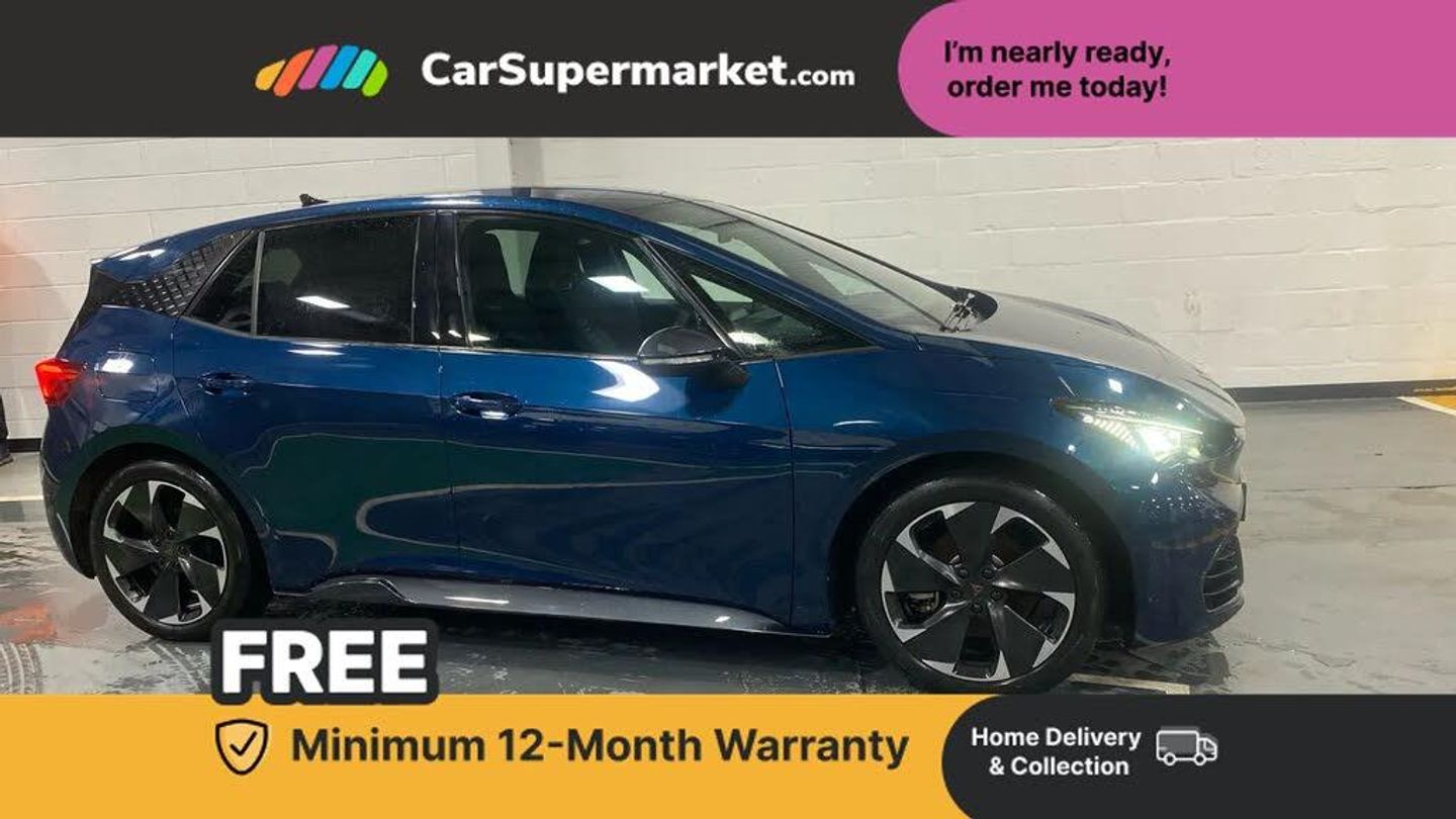 5.3" digital cockpit with 12" central display infotainment system,Augmented reality head up display,Bluetooth without wireless charger,Driving profile selection - Range, Comfort, Performance, Individual,Dynamic steering,Emergency steering support with turn assist,Forward collision warning with automatic braking,Front/rear park distance control,Lane assist,PAS,Tailgate,Voice assistant,Wireless full link smartphone integration,120kW DC charging capacity,7.4 kW onboard charger,Shock absorption in front,Sports rear shock absorption,2x USB sockets in front,2x USB sockets in rear, charge only,DAB (Digital Audio Broadcasting) and AM/FM radio,Acoustic windshield,Auto dimming rear view mirror,Dark tinted rear windows,Daytime running lights,Electric adjustable/heated/folding door mirrors,Full LED headlights,Grey exterior mirrors,Heat insulated glass,Heated washer nozzles,LED 3rd brake light,LED rear lights,Rear side wing doors,Rear wiper,Transport protection film,Variable intermittent wiper,Welcome home function and adverse weather function,Windshield wiper with light/rain sensor,3 seat bench in 2nd row,Aluminium pedals,CUPRA emblem on steering wheel,Dual zone climate control,Electric auxiliary air heater,Heated front seats,Heated leather wrapped multi function steering wheel,Integrated front head restraints,ISOFIX points in outer rear seats with top tether anchorage points,Manual height adjustable front seats,Multi-colour ambient interior lighting,Rear headrests,SEAQUAL Yarn cloth upholstery,Single front passenger seat,Sunvisors with illuminated mirror,Unsplit rear seat bench, split folding backrest, without centre armrest,3 point seatbelts on all rear seats,Driver and front passenger airbags with front passenger airbag deactivation, side airbag in front with curtain airbag and front interaction airbag,Extended safety system with proactive passenger protection system,Manual child lock in rear doors,Public e-call,Tiredness recognition system, driver alert system,Tyre pressure monitoring system,Visual and acoustic seat belt reminder,Anti theft alarm system with interior monitoring in cab, backup horn and towing protection,Anti theft wheel bolts,Keyless go central locking system,19" Typhoon alloy wheels,Tool kit,Tyre repair kit