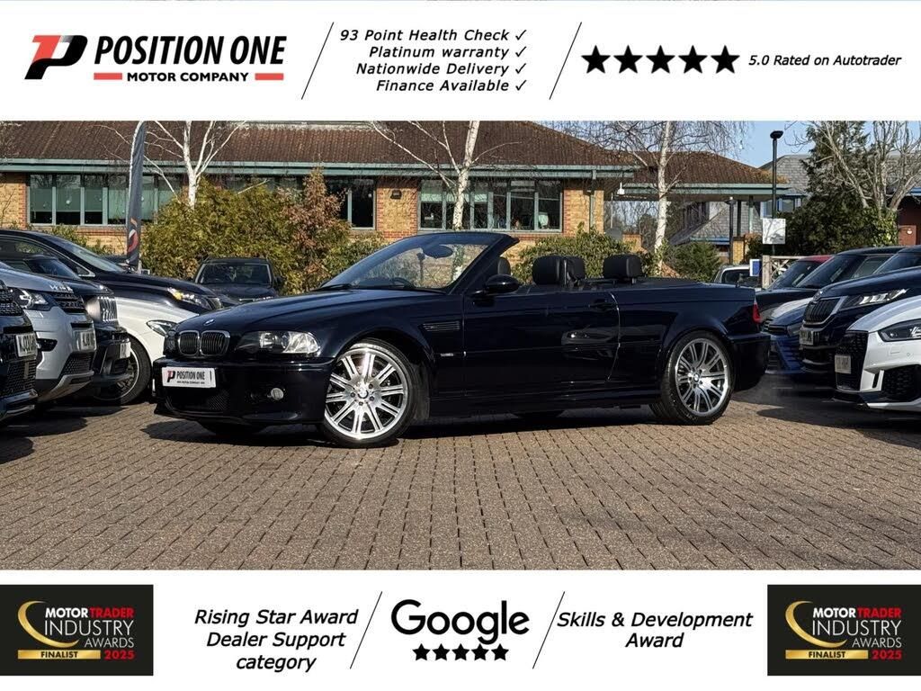 Black interior.At Position One Motor Company, every vehicle undergoes a comprehensive 93 point health check carried out by a main dealer or marque specialist prior to sale, and nationwide delivery is available. We are proud to present this exceptional 2004 BMW M3 Convertible, finished in highly desirable Carbon Black with a full leather interior and presented in excellent condition throughout. Powered by BMWs legendary 3.2 litre naturally aspirated straight six engine producing 343 bhp, this M3 delivers one of the most engaging driving experiences of any modern classic. Paired with a manual gearbox and rear wheel drive, it accelerates from 0 to 60 mph in just 5.5 seconds and reaches a limited top speed of 155 mph. The renowned S54 engine is celebrated for its razor sharp throttle response, distinctive sound and thrilling high revving nature. This example has covered 90,702 miles and benefits from a comprehensive and well documented service history. Service history includes 1,503 miles in August 2004, 11,259 miles in August 2005, 21,904 miles in November 2006, 33,287 miles in July 2009, 40,495 miles in December 2012, 50,876 miles in December 2015, 58,142 miles in January 2017, 65,501 miles in December 2017, 72,489 miles in December 2018, 79,215 miles in December 2019 and 84,227 miles in March 2021. The vehicle has since been carefully stored and has just received a major service in preparation for sale. Specification includes full leather upholstery, 19 inch Double Spoke alloy wheels, Harman Kardon Hi Fi sound system, High Gloss Shadow Line exterior trim, High Gloss interior trim and a fully electric convertible roof. The Carbon Black metallic paintwork highlights the iconic lines of the E46 M3, widely regarded as one of BMW M Divisions finest creations. This manual M3 offers the perfect balance of performance, open top driving and modern classic collectability. With its excellent service history, full leather interior, recent major service and careful ownership, it represents a superb opportunity to acquire a highly desirable example. Extended Platinum warranty available, finance available, part exchange welcome and nationwide delivery available.