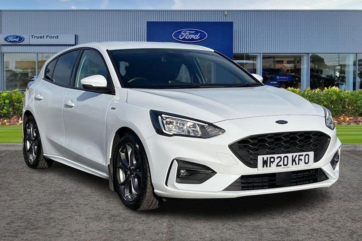 Bluetooth system, Digital clock, Easy fuel capless refuelling system, Eco mode, Ford pass connect, Ford SYNC 3 with 8 TFT touchscreen, and app link Android auto/Apple carplay, Intelligent speed assist, Lane keeping aid with lane departure warning, PAS, Selectable drive mode, Trip computer, 'Quickclear' heated windscreen/heated washer jets, Auto headlamps (on/off), Body colour large rear spoiler, Body colour side skirt, Body coloured bumpers, Body coloured door handles, Body coloured electrically operated and heated door mirrors with side indicators, Electrically operated front and rear windows with one touch opening and closing, Front variable intermittent wipers with electric wash, Halogen reflector headlamps, Heated rear window, LED daytime running lamp, LED front fog lamps with cornering function, Polished twin tailpipe, ST-Line upper and lower grille with full body styling kit and wing badges, Tailgate wash/wipe, 3 spoke flat bottomed leather steering wheel with red stitching, 60/40 split back and cushion rear seats with 2 height adjustable headrests, Alloy finish pedals, Aluminium gear knob, Centre console with armrest, Cloth upholstery with red stitching, Dark headliner, Driver's lumbar support, Front floor mats, Height adjustable front headrests, Isofix child seat preparation, Manual air conditioning, Reach + rake adjustable steering column, Rear centre headrest, ABS+Electronic Brake force Distribution, Auto hold function, Driver airbag, Electronic parking brake, Electronic stability control, Front and rear seatbelt reminder, Front inertia reel height adjustable seatbelts with pre-tensioners, Front passenger airbag, Front side airbags, Hill start assist, Passenger airbag deactivate switch, Post collision braking, Pre collision assist with autonomous emergency braking and pedestrian/cyclist detection, Side curtain airbags, Three rear inertia reel lap/diagonal seatbelts, Tyre pressure monitoring system