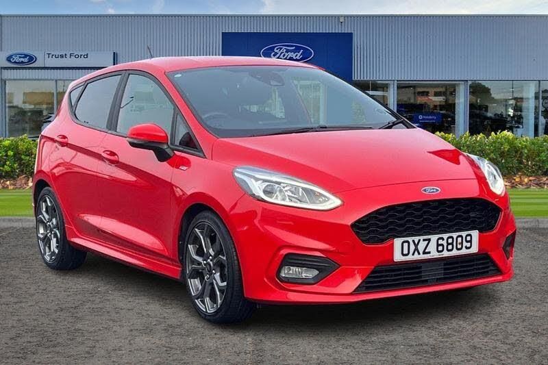 Bluetooth system, Electric power steering, Ford easy fuel, Ford SYNC 3 Navigation system incl 8 touchscreen, 7 speakers, FordPass connect, Apple carplay, android auto, voice control and emergency assistance, Rear parking distance sensors, Selectable drive modes (Normal, Sport, Track), Trip computer, Body colour bumpers, Body colour door handles, Body colour large rear spoiler, Body coloured electrically operated and heated door mirrors with side indicators, Cornering front fog lights, Electric front windows/one touch facility, Electric rear windows, LED Night signature to rear lights, Quickclear heated windscreen, Rain sensing wipers and auto dimming rear view mirror, Rear privacy glass, Rear wiper, Unique ST-Line upper grille & full bodystyling kit with ST-Line wing badges, 3 spoke flat bottomed leather steering wheel, 60/40 split folding rear seat, Adjustable head restraints, Black headlining, Boot carpet, Centre console with opening armrest, 2x cupholders, 12v and USB, Chrome inner door handles, Cloth upholstery, Footwell illumination, Front floor mats in velour, Front map reading lights, Front seat and rear pockets, Illuminated glovebox, Leather gaiter, Load area light, Manual 2 way passenger seat adjust, Manual 4-way driver seat adjust, Manual air conditioning, Overhead console with sunglasses holder, Pollen filter, Rake/reach adjustable steering wheel, Sensico wrapped steering wheel, Sports front seats, 3 point seatbelts on all rear seats, ABS+EBA, Curtain airbags, Driver and passenger airbags, Drivers knee airbag, Electronic stability control with hill start assist, Front passenger airbag deactivation, Front side airbags, Seatbelt warning, Two tone horn, Tyre pressure monitoring system