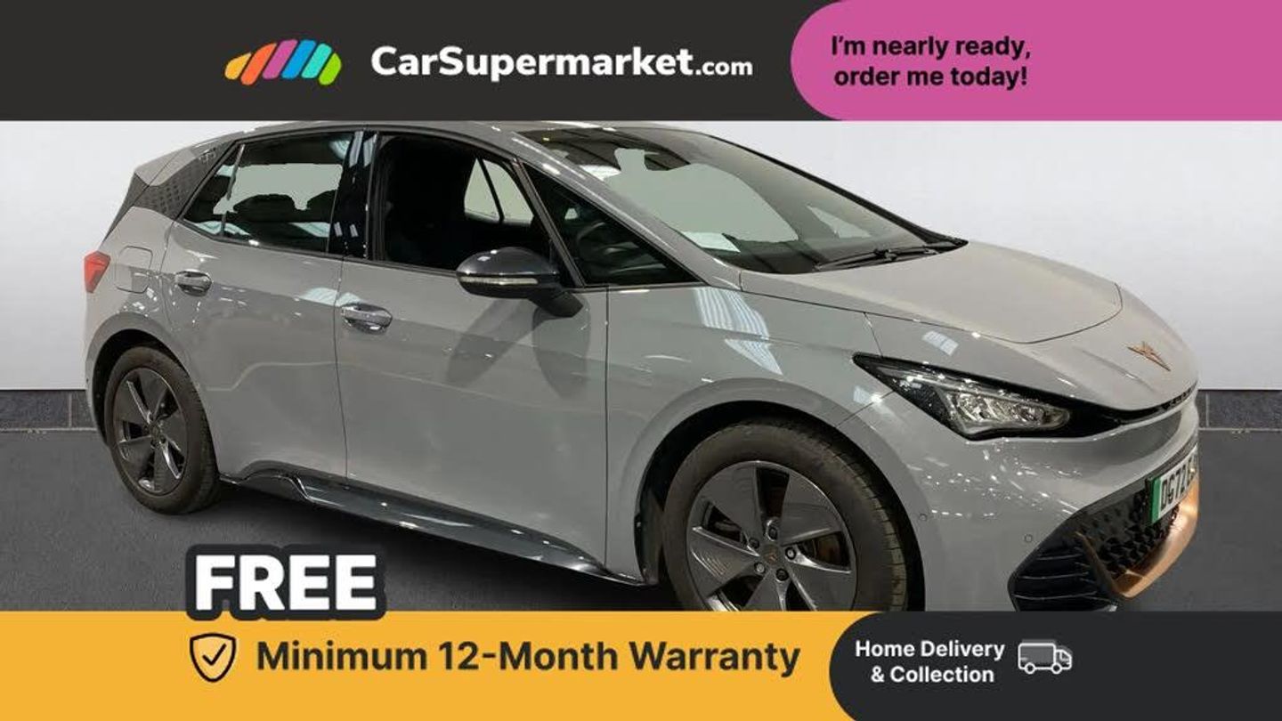 5.3" digital cockpit with 12" central display infotainment system,Bluetooth without wireless charger,Driving profile selection - Range, Comfort, Performance, Individual,Dynamic steering,e-call service,Emergency steering support with turn assist,Forward collision warning with automatic braking,Front/rear park distance control,Lane assist,PAS,Tailgate,Voice assistant,Wireless full link smartphone integration,120kW DC charging capacity,Shock absorption in front,Sports rear shock absorption,2x USB sockets in front,2x USB sockets in rear, charge only,DAB (Digital Audio Broadcasting) and AM/FM radio,Acoustic windshield,Auto dimming rear view mirror,Daytime running lights,Electric adjustable/heated/folding door mirrors,Full LED headlights,Grey exterior mirrors,Heat insulated glass,LED 3rd brake light,LED rear lights,Rear side wing doors,Rear wiper,Transport protection film,Variable intermittent wiper,Welcome home function and adverse weather function,Windshield wiper with light/rain sensor,3 seat bench in 2nd row,Aluminium pedals,CUPRA emblem on steering wheel,Dual zone climate control,Electric auxiliary air heater,Heated leather wrapped multi function steering wheel,Integrated front head restraints,ISOFIX points in outer rear seats with top tether anchorage points,Manual height adjustable front seats,Multi-colour ambient interior lighting,Rear headrests,SEAQUAL Yarn cloth upholstery,Single front passenger seat,Sunvisors with illuminated mirror,Unsplit rear seat bench, split folding backrest, without centre armrest,Pilot M pack - Born,3 point seatbelts on all rear seats,Driver and front passenger airbags with front passenger airbag deactivation, side airbag in front with curtain airbag and front interaction airbag,Extended safety system with proactive passenger protection system,Manual child lock in rear doors,Tiredness recognition system, driver alert system,Tyre pressure monitoring system,Visual and acoustic seat belt reminder,Anti theft alarm system with interior monitoring in cab, backup horn and towing protection,Anti theft wheel bolts,Keyless go central locking system,18" Cyclone alloy wheels,Tool kit,Tyre repair kit