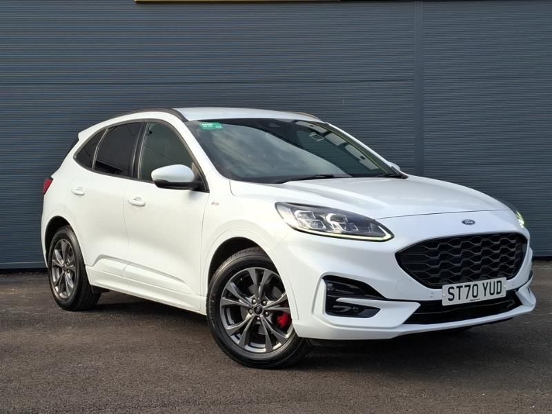 Mobile phone wireless charging pad, Front and rear parking sensors, B&O with large instrument cluster pack - Kuga, ST Line body styling kit with unique front and rear fascia and bumper, rear painted diffuser, front painted skid plates, dark mesh upper grille, Hands free power tailgate, Lane keeping aid with lane departure warning, Rear parking sensor, ST Line front scuff plates, Quickclear heated windscreen, Day/night rear view mirror, Black roof rails, Front and rear head restraints, Ford MyKey Gen 2 safety system, Auto headlamps with high and low beam