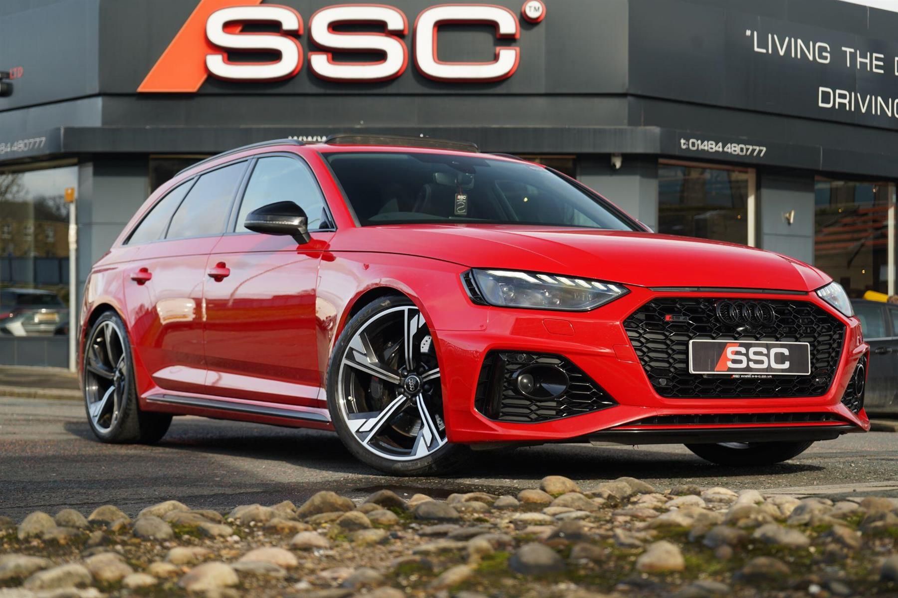 Stunning RS4 Finished In Tango Red Metallic With Black Honeycomb Quilted Fine Nappa Leather. Extensive Spec Inc: Panoramic Sunroof, RS Sports Exhaust, RS Sports Suspension Plus, Black Styling Pack, Bang & Olufsen Surround Sound, Carbon Inlays, Rear Heated Seats, Electric Seats With Massage and Driver Memory, Tyre Pressure Monitoring, Full Leather Pack, Extended Interior Lighting Pack, Storage Pack, Black Roof Rails, 20'' Alloys, Side Assist, Keyless Entry, Power Folding and Auto Dimming Mirrors With Memory, Speed Limiter. This RS4 Comes With Full Service History.