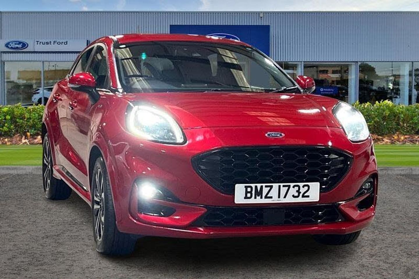 Driver impairment monitor, Emergency call service, Ford easy fuel, Full digital 12.3 instrument cluster, Lane keeping aid with lane departure warning, Power assist steering, Power start button, Rear parking sensor, Selectable drive modes(Normal, Eco, Sport, Slippery and Trail), Speed sign recognition, Automatic headlights with auto high beam, Automatic rain sensing wipers, LED rear lamps, Power foldable heated door mirrors with puddle lamps, Projector headlamps with LED day time running lights and front fog lamps, Quickclear heated windscreen, Rear side wing doors, Rear wiper, ST-Line body styling kit with unique grille, Third brake light, 3 seat bench in 2nd row, Centre console with armrest and stowage, Ford megabox extended bootspace, Front and rear head restraints, Front floor mats, Manual 2 way passenger seat adjustment, Manual 4 way driver seat adjust with lumbar adjustment, Single front passenger seat, ST- Line cloth trim with red stitching, ST-Line flat bottomed sensico leather steering wheel with leather handbrake and aluminium gear knob, 3 rear seatbelts, Child safety lock, Electronic stability control (ESC) and hill start assist, Pedestrian/cyclist detection & post-collision braking, Pre collision assist system, Tyre pressure monitoring system (TPMS)