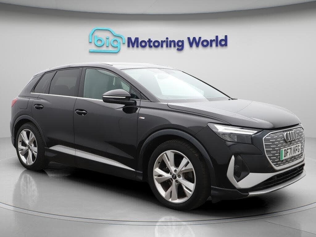 Part Leather Seats,Apple CarPl-Our Audi Q4 e-tron is finished in Black. Specification includes a range of fantastic features including Part Leather Seats, Apple CarPlay, Lane Assist, S Line Body Styling, Android Auto, Satellite Navigation, Privacy Glass, Heated Seats, Bluetooth, Parking Sensors Specification information is supplied by CAPHPI and may vary to the actual car. This data does not form any part of a buying contact. Please check specification prior to purchase in-store. The MOT is valid until February 2027, visit bigmotoringworld.co.uk for more photos, a 360 tour, service history and a free HPI report.Were BIG on peace of mind and this Black Audi Q4 e-tron has completed our comprehensive 200 point inspection and passed all checks. Its ready for you to drive away with immediate collection in-store. We include a 90-day warranty as standard plus an option to extend for up to 3 years.Reserve this car exclusively for you, safely and securely at bigmotoringworld.co.uk, with a fully refundable £99 deposit. Test drive before you buy, with no commitment, no hassle and a completely haggle free experience. Still searching and want to see thousands more cars? We are BIG on choice with over 8000 cars to choose from.Visit our award winning web site bigmotoringworld.co.uk.Were Big Motoring World and were BIG on what matters to you.