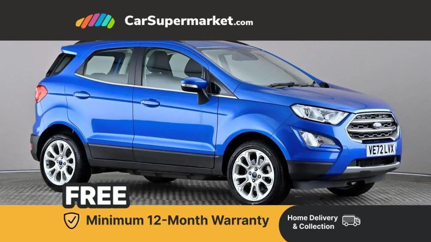 Cruise Control, Sat Nav, Android Auto, Apple CarPlay, Parking Sensors, Traffic Sign Recognition, 17" Alloy Wheels;Blue EcoSport Titanium with cruise control, satellite navigation, Apple CarPlay, Android Auto, parking sensors, traffic sign recognition, and 17-inch alloy wheels. Optional Desert Island Blue paint valued at £525. Last serviced on 13 February 2026. MOT due 24 November 2026.