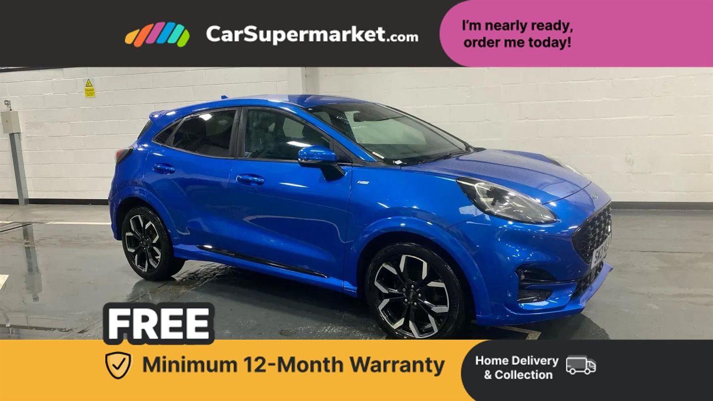 Ford easy fuel,Full digital 12.3" instrument cluster,Power assist steering,Power start button,Rear parking sensor,Selectable drive modes(Normal, Eco, Sport, Slippery and Trail),Wireless charging pad,Automatic rain sensing wipers,Body coloured door mirrors,Front fog lights with cornering lights and LED rear lamps,Power foldable heated door mirrors with puddle lamps,Privacy glass to side rear windows and tailgate glass,Quickclear heated windscreen,Rear wiper,ST-Line body kit with large rear spoiler wth sports suspension,Centre console with armrest and stowage,Driver and passenger seat lumbar and height adjust,Ford megabox extended bootspace,Front and rear head restraints,Manual air conditioning,Sensico partial premium upholstery,Wireless charging pad with electronic air temperature control (EATC),B&O Premium Audio system + Ford SYNC 3 navigation pack - Puma,Driver assistance pack with Lane departure warning - Puma,3 rear seatbelts,Electronic stability control (ESC) and hill start assist,Pedestrian/cyclist detection & post-collision braking,Tyre pressure monitoring system (TPMS),Thatcham alarm,Carbon look interior deco spears,Desert Island Blue,Handsfree Power Tailgate,Partial Premium Sensico - Black with Red Stitching,Winter Pack