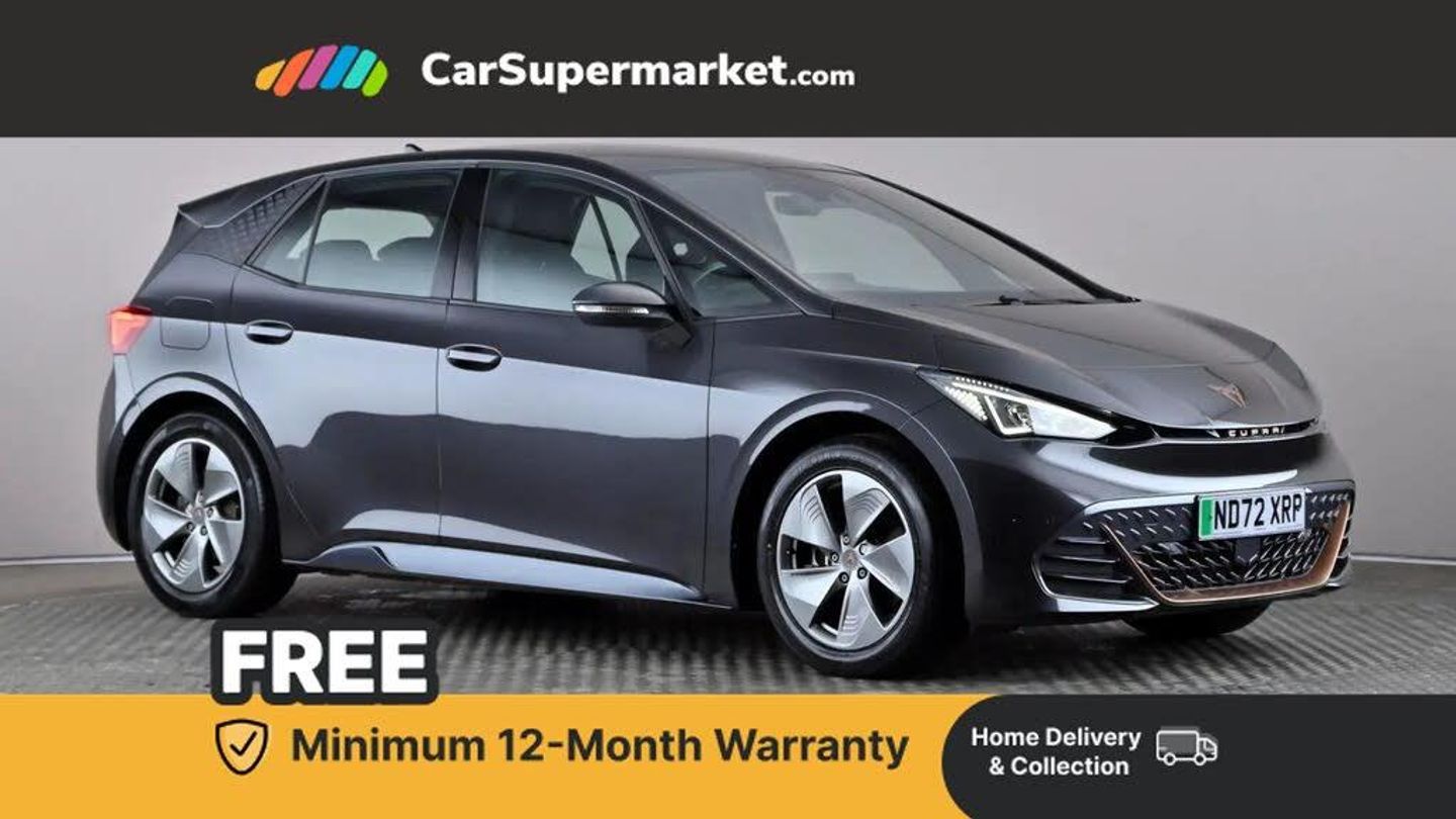 5.3" digital cockpit with 12" central display infotainment system,Bluetooth without wireless charger,Driving profile selection - Range, Comfort, Performance, Individual,Dynamic steering,Emergency steering support with turn assist,Forward collision warning with automatic braking,Front/rear park distance control,Lane assist,PAS,Tailgate,Voice assistant,Wireless full link smartphone integration,120kW DC charging capacity,Shock absorption in front,Sports rear shock absorption,2x USB sockets in front,2x USB sockets in rear, charge only,DAB (Digital Audio Broadcasting) and AM/FM radio,Acoustic windshield,Auto dimming rear view mirror,Daytime running lights,Electric adjustable/heated/folding door mirrors,Full LED headlights,Grey exterior mirrors,Heat insulated glass,LED 3rd brake light,LED rear lights,Rear side wing doors,Rear wiper,Transport protection film,Variable intermittent wiper,Welcome home function and adverse weather function,Windshield wiper with light/rain sensor,3 seat bench in 2nd row,Aluminium pedals,CUPRA emblem on steering wheel,Dual zone climate control,Electric auxiliary air heater,Heated leather wrapped multi function steering wheel,Integrated front head restraints,ISOFIX points in outer rear seats with top tether anchorage points,Manual height adjustable front seats,Multi-colour ambient interior lighting,Rear headrests,SEAQUAL Yarn cloth upholstery,Single front passenger seat,Sunvisors with illuminated mirror,Unsplit rear seat bench, split folding backrest, without centre armrest,3 point seatbelts on all rear seats,Driver and front passenger airbags with front passenger airbag deactivation, side airbag in front with curtain airbag and front interaction airbag,Extended safety system with proactive passenger protection system,Manual child lock in rear doors,Public e-call,Tiredness recognition system, driver alert system,Tyre pressure monitoring system,Visual and acoustic seat belt reminder,Anti theft alarm system with interior monitoring in cab, backup horn and towing protection,Anti theft wheel bolts,Keyless go central locking system,18" Cyclone alloy wheels,Tool kit,Tyre repair kit
