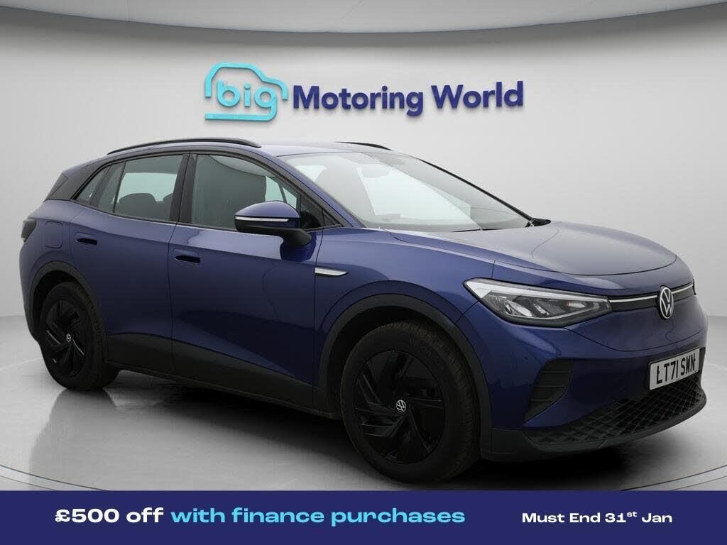£500 towards your finance depo-Our Volkswagen ID.4 comes with optional extras worth £635. Specification includes a range of fantastic features including £500 towards your finance deposit, Part Leather Seats, Apple CarPlay, Lane Assist, Android Auto, Satellite Navigation, Heated Seats, Heated Steering Wheel, Bluetooth, Parking Sensors Specification information is supplied by CAPHPI and may vary to the actual car. This data does not form any part of a buying contact. Please check specification prior to purchase in-store. The MOT is valid until February 2027, visit bigmotoringworld.co.uk for more photos, a 360 tour, service history and a free HPI report.Were BIG on peace of mind and this Blue Volkswagen ID.4 has completed our comprehensive 200 point inspection and passed all checks. Its ready for you to drive away with immediate collection in-store. We include a 90-day warranty as standard plus an option to extend for up to 3 years.Reserve this car exclusively for you, safely and securely at bigmotoringworld.co.uk, with a fully refundable £99 deposit. Test drive before you buy, with no commitment, no hassle and a completely haggle free experience. Still searching and want to see thousands more cars? We are BIG on choice with over 8000 cars to choose from.Visit our award winning web site bigmotoringworld.co.uk.Were Big Motoring World and were BIG on what matters to you.