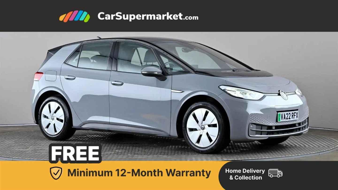 10" touch screen infotainment system,5.3" Digital dashboard display,Adaptive cruise control including Front Assist, radar sensor controlled distance monitoring system, City emergency braking system,speed limiter,BLIS (Blind spot information system),Bluetooth connectivity,Car2X technology,Driver alert system,Driver profile selection with personalisation,E-call,Front and rear parking sensors,ID. Light,Lane assist,Natural voice control,Power assisted speed sensitive steering,Remote tailgate unlocking,Security and service (SOS buttons),Trip computer,Wireless app connect,Exterior e-sound,Mode 3 32-amp / 7.2kW charging cable for charging at public charge points,DAB Digital radio,Sound system,Touch control,All LED headlights with reflector technology,Black roof,Body colour door handles,Body coloured bumpers,Body coloured door mirrors with intergrated indicators,Front and rear electric windows,Heated rear window,LED 3rd brake lamp,Rear side wing doors,Rear wiper,Separate LED daytime running lights which also perform the indicator function,Variable front intermittent wipers,1 Zone climatronic,3 seat bench in 2nd row,Driver seat height adjust,Folding rear seats,Fragment design cloth upholstery,Front headrests,Isofix child seat anchor points,Multi-function steering wheel,Pause and play pedals,Pockets and smartphone pockets in seats,Reach + rake adjustable steering column,Rear headrests,Single front passenger seat,Standard seats,Comfort pack - ID.3,Infotainment pack with wireless smartphone charging - ID.3,NCAP pack - ID.3,3x3 point rear seat belts,Anti-lock braking system (ABS),Child locks on rear doors,Driver and passenger airbags,Electronic parking brake with auto hold,Electronic Stability Programme (ESP),Front and rear curtain airbags,Front passenger airbag deactivation,Side airbags,Traction control with on/off button,Tyre pressure monitor,Alarm,Immobiliser,Keyless Go,Remote central locking,Tool kit,Tyre repair kit