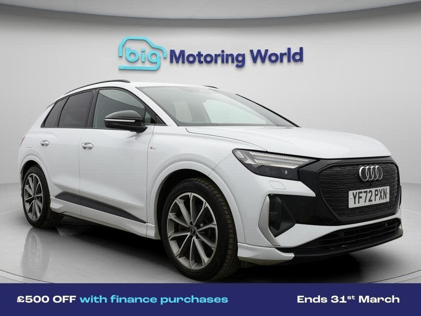 £500 towards your finance depo-Our Audi Q4 e-tron is finished in White. Specification includes a range of fantastic features including £500 towards your finance deposit, Head up Display, Leather Seats, Apple CarPlay, Electric Seats, Lane Assist, S Line Body Styling, Android Auto, Satellite Navigation, Privacy Glass Specification information is supplied by CAPHPI and may vary to the actual car. This data does not form any part of a buying contact. Please check specification prior to purchase in-store. The MOT is valid until November 2026, visit bigmotoringworld.co.uk for more photos, a 360 tour, service history and a free HPI report.Were BIG on peace of mind and this White Audi Q4 e-tron has completed our comprehensive 200 point inspection and passed all checks. Its ready for you to drive away with immediate collection in-store. We include a 90-day warranty as standard plus an option to extend for up to 3 years.Reserve this car exclusively for you, safely and securely at bigmotoringworld.co.uk, with a fully refundable £99 deposit. Test drive before you buy, with no commitment, no hassle and a completely haggle free experience. Still searching and want to see thousands more cars? We are BIG on choice with over 8000 cars to choose from.Visit our award winning web site bigmotoringworld.co.uk.Were Big Motoring World and were BIG on what matters to you.