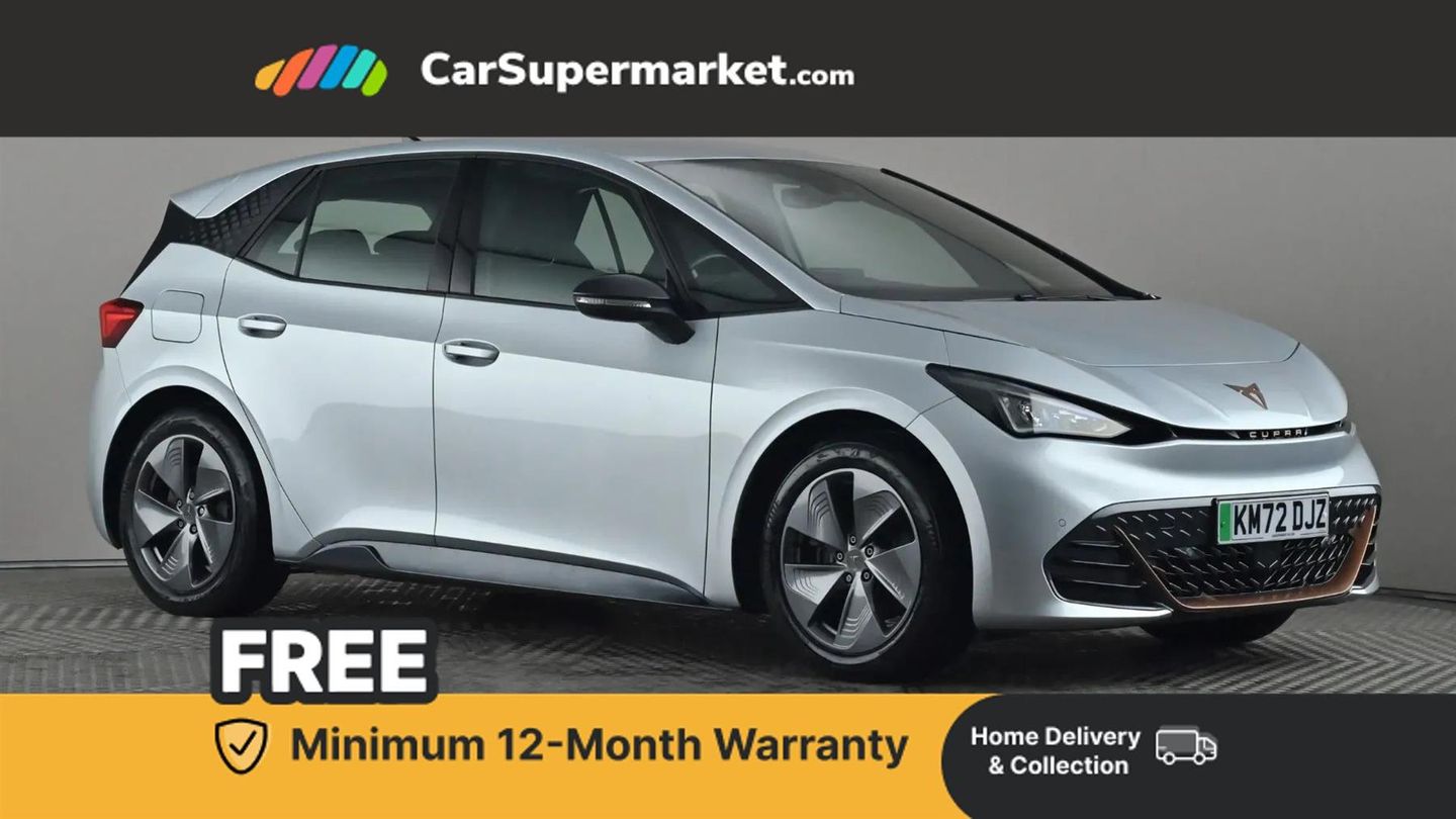 5.3" digital cockpit with 12" central display infotainment system,Bluetooth without wireless charger,Driving profile selection - Range, Comfort, Performance, Individual,Dynamic steering,Emergency steering support with turn assist,Forward collision warning with automatic braking,Front/rear park distance control,Lane assist,PAS,Tailgate,Voice assistant,Wireless full link smartphone integration,120kW DC charging capacity,Shock absorption in front,Sports rear shock absorption,2x USB sockets in front,2x USB sockets in rear, charge only,DAB (Digital Audio Broadcasting) and AM/FM radio,Acoustic windshield,Auto dimming rear view mirror,Daytime running lights,Electric adjustable/heated/folding door mirrors,Full LED headlights,Grey exterior mirrors,Heat insulated glass,LED 3rd brake light,LED rear lights,Rear side wing doors,Rear wiper,Transport protection film,Variable intermittent wiper,Welcome home function and adverse weather function,Windshield wiper with light/rain sensor,3 seat bench in 2nd row,Aluminium pedals,CUPRA emblem on steering wheel,Dual zone climate control,Electric auxiliary air heater,Heated leather wrapped multi function steering wheel,Integrated front head restraints,ISOFIX points in outer rear seats with top tether anchorage points,Manual height adjustable front seats,Multi-colour ambient interior lighting,Rear headrests,SEAQUAL Yarn cloth upholstery,Single front passenger seat,Sunvisors with illuminated mirror,Unsplit rear seat bench, split folding backrest, without centre armrest,3 point seatbelts on all rear seats,Driver and front passenger airbags with front passenger airbag deactivation, side airbag in front with curtain airbag and front interaction airbag,Extended safety system with proactive passenger protection system,Manual child lock in rear doors,Public e-call,Tiredness recognition system, driver alert system,Tyre pressure monitoring system,Visual and acoustic seat belt reminder,Anti theft alarm system with interior monitoring in cab, backup horn and towing protection,Anti theft wheel bolts,Keyless go central locking system,18" Cyclone alloy wheels,Tool kit,Tyre repair kit