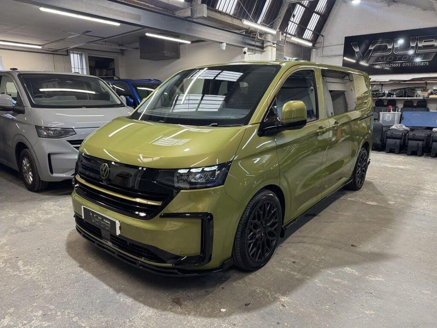 Volkswagen "T7" Custom Kombi, new generation Transporter 150tdi automatic, Commerce Plus T30 SWB, Warm Green. Never has Warm Green looked so hot! 75reg with 99 miles. LED lights, captain passenger seat, rear camera and tailgate. Custom Kombi with our rear flexi seat system consisting of 3 individual rear seats that are position adjustable, recline, fold flat, removable, create a centre table and have Isofix to the outer seats. Reupholstered in black leather and Alcantara with Horizontal Hex design and light green stitch-work. Fully lined out to the rear with light grey suede effect over dark grey automotive carpeting. Sound deadened and insulated. To complete this stunning interior our T7 Custom Kombi also includes the Vdub GT steering with green stitch-work. Finished in Warm Green this Plus specification Transporter is further enhanced with the Vdub exterior styling works to include 20" Velar alloy wheels, lowered suspension, gloss black colour coding to the front grill, body colour and gloss black VW badges, gloss black front splitter, side + rear skirts and rear spoiler. Finance arranged and part exchange vehicles welcomed. Viewing by appointment, please message or ring to arrange. Mainland UK delivery available. Vdub Motors…home of the Custom Kombi
