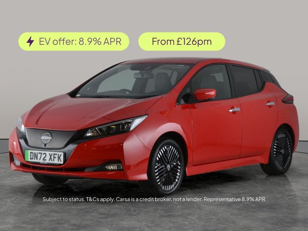 Experience electric driving with this Nissan Leaf Hatchback in a stunning red finish. Enjoy effortless journeys with Adaptive Cruise Control, seamless connectivity via Apple CarPlay, and immersive sound from the BOSE Audio System. Easily manoeuvre with the 360 Degree Camera and Around View Monitor. Stay comfortable with heated seats and the Heat Pack, plus enjoy year-round convenience with Keyless Entry and Sat Nav. Advanced safety features like Intelligent Lane Intervention and Blind Spot Assist offer fantastic peace of mind. 1 service recorded, last serviced on 12/02/2026 at 20,333 miles. MOT to 16/11/2026. Visit our website for service history, online valuation, full vehicle specification plus multiple images. This vehicle is VAT qualifying. Any feature/option specified here is from 3rd party data. We cannot guarantee the accuracy of any specification supplied by a 3rd party. We recommend that you physically check the specification of the vehicle on site prior to purchase. This information does not form part of the buying contract. Terms & Conditions apply. We have over 2,000 cars available from our 10 national branches, check our website to see all our stock. Our Trustpilot rating is 4.4/5 with over 9,000 reviews.