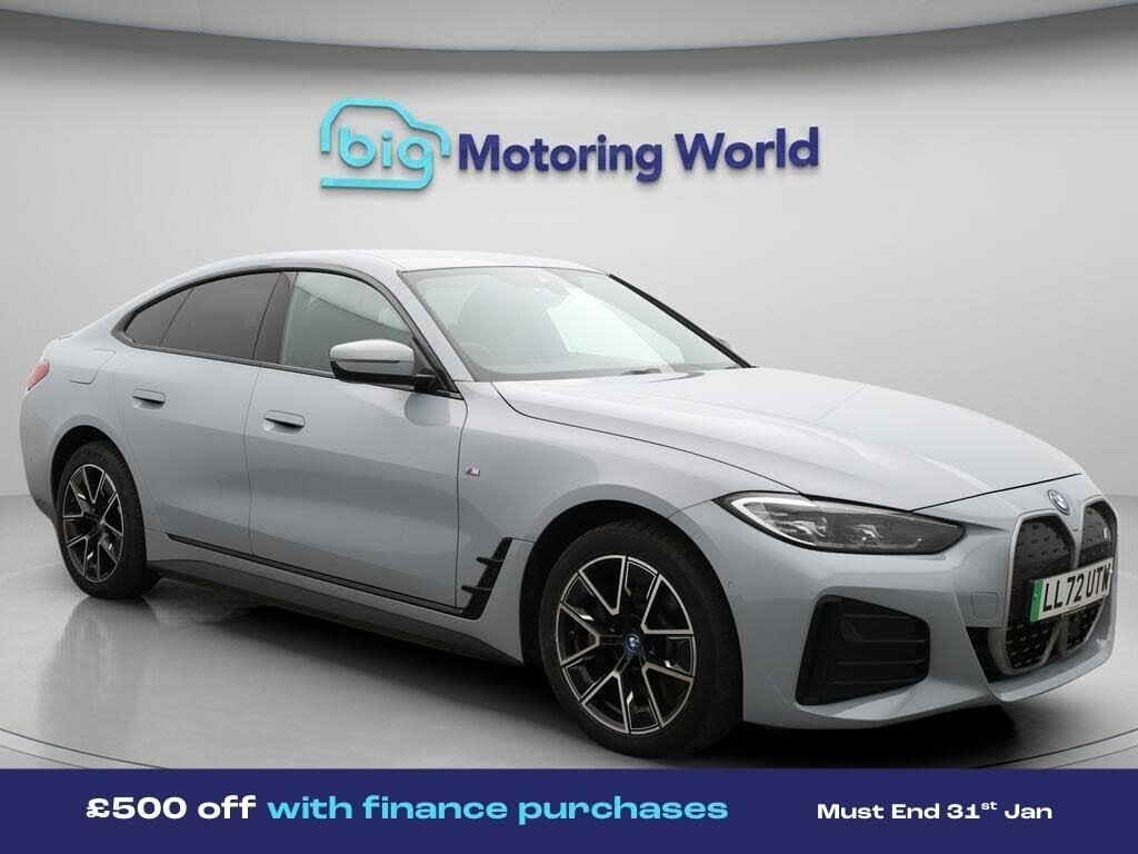 £500 towards your finance depo-Our BMW i4 comes with optional extras worth £1,195. Specification includes a range of fantastic features including £500 towards your finance deposit, Sun Protection Pack, Leather Seats, Apple CarPlay, Connected Package Professional, M Sport Exterior Styling Pack, M Sport Bodykit, Android Auto, Satellite Navigation, Privacy Glass Specification information is supplied by CAPHPI and may vary to the actual car. This data does not form any part of a buying contact. Please check specification prior to purchase in-store. The MOT is valid until November 2026, visit bigmotoringworld.co.uk for more photos, a 360 tour, service history and a free HPI report.Were BIG on peace of mind and this Grey BMW i4 has completed our comprehensive 200 point inspection and passed all checks. Its ready for you to drive away with immediate collection in-store. We include a 90-day warranty as standard plus an option to extend for up to 3 years.Reserve this car exclusively for you, safely and securely at bigmotoringworld.co.uk, with a fully refundable £99 deposit. Test drive before you buy, with no commitment, no hassle and a completely haggle free experience. Still searching and want to see thousands more cars? We are BIG on choice with over 8000 cars to choose from.Visit our award winning web site bigmotoringworld.co.uk.Were Big Motoring World and were BIG on what matters to you.